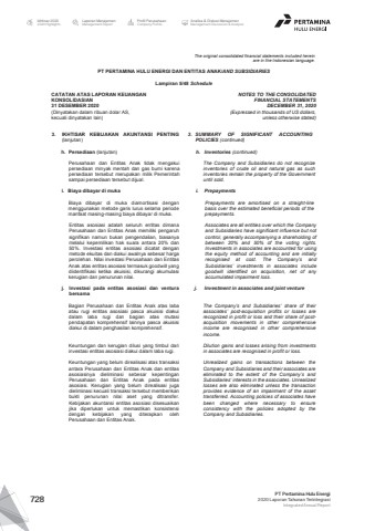 The original consolidated financial statements included hereinare in the Indonesian language.PT PERTAMINA HULU ENERGI DAN ENTITAS ANAK/AND SUBSIDIARIES Lampiran 5/48 ScheduleCATATAN ATAS LAPORAN KEUANGANKONSOLIDASIAN31 DESEMBER 2020(Dinyatakan dalam ribuan dolar AS, kecuali dinyatakan lain)NOTES TO THE CONSOLIDATEDFINANCIAL STATEMENTSDECEMBER 31, 2020(Expressed in thousands of US dollars,unless otherwise stated)3. IKHTISAR KEBIJAKAN AKUNTANSI PENTING(lanjutan)3. SUMMARY OF SIGNIFICANT ACCOUNTINGPOLICIES (continued)h. Persediaan (lanjutan) h. Inventories (continued)Perusahaan dan Entitas Anak tidak mengakuipersediaan minyak mentah dan gas bumi karenapersediaan tersebut merupakan milik Pemerintahsampai persediaan tersebut dijual.The Company and Subsidiaries do not recognizeinventories of crude oil and natural gas as suchinventories remain the property of the Governmentuntil sold.i. Biaya dibayar di muka i. PrepaymentsBiaya dibayar di muka diamortisasi denganmenggunakan metode garis lurus selama periodemanfaat masing-masing biaya dibayar di muka.Prepayments are amortised on a straight-linebasis over the estimated beneficial periods of theprepayments.Entitas asosiasi adalah seluruh entitas dimanaPerusahaan dan Entitas Anak memiliki pengaruhsignifikan namun bukan pengendalian, biasanyamelalui kepemilikan hak suara antara 20% dan50%. Investasi entitas asosiasi dicatat denganmetode ekuitas dan diakui awalnya sebesar hargaperolehan. Nilai investasi Perusahaan dan EntitasAnak atas entitas asosiasi termasuk goodwill yangdiidentifikasi ketika akuisisi, dikurangi akumulasikerugian dan penurunan nilai.Associates are all entities over which the Companyand Subsidiaries have significant influence but notcontrol, generally accompanying a shareholding ofbetween 20% and 50% of the voting rights.Investments in associates are accounted for usingthe equity method of accounting and are initiallyrecognised at cost. The Company%u2019s andSubsidiaries%u2019 investments in associates includegoodwill identified on acquisition, net of anyaccumulated impairment loss.j. Investasi pada entitas asosiasi dan venturabersamaj. Investment in associates and joint ventureBagian Perusahaan dan Entitas Anak atas labaatau rugi entitas asosiasi pasca akuisisi diakuidalam laba rugi dan bagian atas mutasipendapatan komprehensif lainnya pasca akuisisidiakui di dalam penghasilan komprehensif.The Company%u2019s and Subsidiaries%u2019 share of theirassociates%u2019 post-acquisition profits or losses arerecognized in profit or loss and their share of postacquisition movements in other comprehensiveincome are recognised in other comprehensiveincome.Keuntungan dan kerugian dilusi yang timbul dariinvestasi entitas asosiasi diakui dalam laba rugi.Dilution gains and losses arising from investmentsin associates are recognised in profit or loss.Keuntungan yang belum direalisasi atas transaksiantara Perusahaan dan Entitas Anak dan entitasasosiasinya dieliminasi sebesar kepentinganPerusahaan dan Entitas Anak pada entitasasosiasi. Kerugian yang belum direalisasi jugadieliminasi kecuali transaksi tersebut memberikanbukti penurunan nilai aset yang ditransfer.Kebijakan akuntansi entitas asosiasi disesuaikanjika diperlukan untuk memastikan konsistensidengan kebijakan yang diterapkan olehPerusahaan dan Entitas Anak.Unrealized gains on transactions between theCompany and Subsidiaries and their associates areeliminated to the extent of the Company%u2019s andSubsidiaries%u2019 interests in the associates. Unrealizedlosses are also eliminated unless the transactionprovides evidence of an impairment of the assettransferred. Accounting policies of associates havebeen changed where necessary to ensureconsistency with the policies adopted by theCompany and Subsidiaries.Laporan ManajemenManagement ReportProfil PerusahaanCompany ProfileAnalisa & Diskusi ManajemenManagement Discussion & AnalysisIkhtisar 20202020 HighlightsPT Pertamina Hulu Energi2020 Laporan Tahunan TerintegrasiIntegrated Annual Report 728