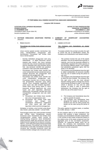 The original consolidated financial statements included hereinare in the Indonesian language.PT PERTAMINA HULU ENERGI DAN ENTITAS ANAK/AND SUBSIDIARIES Lampiran 5/52 ScheduleCATATAN ATAS LAPORAN KEUANGANKONSOLIDASIAN31 DESEMBER 2020(Dinyatakan dalam ribuan dolar AS, kecuali dinyatakan lain)NOTES TO THE CONSOLIDATEDFINANCIAL STATEMENTSDECEMBER 31, 2020(Expressed in thousands of US dollars,unless otherwise stated)3. IKHTISAR KEBIJAKAN AKUNTANSI PENTING(lanjutan)3. SUMMARY OF SIGNIFICANT ACCOUNTINGPOLICIES (continued)l. Sewa (lanjutan) l. Leases (continued)Perusahaan dan Entitas Anak sebagai penyewa(lanjutan)The Company and Subsidiaries as lessee(continued)Untuk menilai apakah kontrak memberikan hakuntuk mengendalikan penggunaan asetidentifikasian, Perusahaan dan Entitas Anakharus menilai apakah:To assess whether the contract provides the rightto control the use of identification assets, theCompany and Subsidiaries must assess whether:- Kontrak melibatkan penggunaan aset yangdiidentifikasi - ini dapat ditentukan secaraeksplisit atau implisit, dan harus berbedasecara fisik atau secara substansial mewakiliseluruh kapasitas aset yang berbeda secarafisik. Jika pemasok memiliki hak substitusisubstantif, maka aset tidak teridentifikasi;- The contract involves the use of the assetsidentified - this can be determined explicitly orimplicitly, and must be physically different orsubstantially represent the entire capacity ofthe physically different assets. If the supplierhas substantive substitution rights, then theasset is not identified;- Perusahaan dan Entitas Anak memiliki hakuntuk memperoleh secara substansial semuamanfaat ekonomik dari penggunaan asetselama periode penggunaan; dan- The Company and Subsidiaries have the rightto obtain substantially all economic benefitsfrom the use of assets during the period ofuse; and- Perusahaan dan Entitas Anak memiliki hakuntuk mengarahkan penggunaan aset.Perusahaan memiliki hak ini ketika memilikihak pengambilan keputusan yang palingrelevan untuk mengubah bagaimana danuntuk tujuan apa aset tersebut digunakan.Dalam kasus yang jarang terjadi di manakeputusan tentang bagaimana dan untuktujuan apa aset digunakan ditentukansebelumnya, Perusahaan memiliki hak untukmengarahkan penggunaan aset jika salahsatu dari:1) Perusahaan dan Entitas Anak memilikihak untuk mengoperasikan aset;2) Perusahaan dan Entitas Anak telahmendesain aset dengan caramenetapkan sebelumnya bagaimanadan untuk tujuan apa aset akandigunakan selama periode penggunaan.- The Company and Subsidiaries have the rightto direct the use of assets. The company hasthis right when it has the most relevantdecision-making rights to change how and forwhat purpose the asset is used. In rare caseswhere a decision on how and for whatpurpose an asset is used is determinedbeforehand, the Company has the right todirect the use of the asset if one of:1) The Company and Subsidiaries have theright to operate the assets;2) The Company and Subsidiaries havedesigned the assets by determining inadvance how and for what purpose theassets will be used during the period ofuse.Kebijakan ini berlaku untuk kontrak yang dibuat,atau diubah, pada atau setelah 1 Januari 2020.This policy applies to contracts made, or modified,on or after January 1, 2020.Pada tanggal insepsi atau pada penilaian kembaliatas kontrak yang mengandung sebuahkomponen sewa, Perusahaan dan Entitas Anakmengalokasikan imbalan dalam kontrak kemasing-masing komponen sewa berdasarkanharga tersendiri relatif dari komponen sewa danharga tersendiri agregat dari komponen nonsewa.Namun, untuk sewa penunjang dimana bertindaksebagai penyewa, Perusahaan dan Entitas Anakmemutuskan untuk tidak memisahkan komponennonsewa dan mencatat komponen sewa dannonsewa tersebut sebagai satu komponen sewa.On the inception date or on the revaluation of thecontract that contains a lease component, theCompany and Subsidiaries allocate compensationin the contract to each lease component based onthe relative price of the lease component and theaggregate price of the non-leased component.However, for supporting leases which act aslessee, the Company and Subsidiaries havedecided not to separate the non-leased componentand record it as one component.Laporan ManajemenManagement ReportProfil PerusahaanCompany ProfileAnalisa & Diskusi ManajemenManagement Discussion & AnalysisIkhtisar 20202020 HighlightsPT Pertamina Hulu Energi2020 Laporan Tahunan TerintegrasiIntegrated Annual Report 732