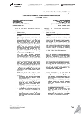 The original consolidated financial statements included hereinare in the Indonesian language.PT PERTAMINA HULU ENERGI DAN ENTITAS ANAK/AND SUBSIDIARIES Lampiran 5/53 ScheduleCATATAN ATAS LAPORAN KEUANGANKONSOLIDASIAN31 DESEMBER 2020(Dinyatakan dalam ribuan dolar AS, kecuali dinyatakan lain)NOTES TO THE CONSOLIDATEDFINANCIAL STATEMENTSDECEMBER 31, 2020(Expressed in thousands of US dollars,unless otherwise stated)3. IKHTISAR KEBIJAKAN AKUNTANSI PENTING(lanjutan)3. SUMMARY OF SIGNIFICANT ACCOUNTINGPOLICIES (continued)l. Sewa (lanjutan) l. Leases (continued)Perusahaan dan Entitas Anak sebagai penyewa(lanjutan)The Company and Subsidiaries as lessee(continued)Pada tanggal permulaan, Perusahaan danEntitas Anak mengakui aset hak guna danliabilitas sewa. Aset hak guna diukur pada biayaperolehan, dimana meliputi jumlah pengukuranawal liabilitas sewa yang disesuaikan denganpembayaran sewa yang dilakukan atau sebelumtanggal permulaan, ditambah dengan biayalangsung awal yang dikeluarkan dan estimasibiaya yang akan dikeluarkan untuk membongkardan memindahkan aset pendasar atau untukmerestorasi aset pendasar ke kondisi yangdisyaratkan dan ketentuan sewa, dikurangidengan insentif sewa yang diterima.At the commencement date, the Company andSubsidiaries recognise lease rights and leaseassets. Right to use assets are measured at cost,which includes the initial measurement of thelease liability adjusted for the lease paymentsmade or before the commencement date, plus theinitial direct costs incurred and the estimated coststo be incurred to decommisioning and move theunderlying assets or to restore the underlyingassets to the conditions required and the terms ofthe lease, less the rent incentives received.Aset hak guna kemudian disusutkanmenggunakan metode garis lurus dari tanggalpermulaan hingga tanggal yang lebih awal antaraakhir umur manfaat aset hak guna atau akhirmasa sewa.Right to use assets are then depreciated using thestraight-line method from the commencement dateto the earliest date between the end of the usefullife of the right to use assets or the end of the leaseperiod.Liabilitas sewa diukur pada nilai kini pembayaransewa yang belum dibayar pada tanggalpermulaan, didiskontokan dengan menggunakansuku bunga implisit dalam sewa atau jika sukubunga tersebut tidak dapat ditentukan, makamenggunakan suku bunga pinjaman inkremental.Pada umumnya, Perusahaan dan Entitas Anakmenggunakan suku bunga pinjaman sebagaisuku bunga.Lease liabilities are measured at the present valueof the unpaid rent payments at the beginning date,discounted using the implicit interest rate in thelease or if the interest rate cannot be determined,then using an incremental loan interest rate.Generally, the Company and Subsidiaries useloan interest rates as interest rates.Pembayaran sewa yang termasuk dalampengukuran liabilitas sewa meliputi pembayaranberikut ini:Lease payments included in the measurement oflease obligations include the following payments:- pembayaran tetap, termasuk pembayarantetap secara substansi dikurangi denganpiutang insentif sewa;- fixed payments, including fixed payments thatare substantially reduced by lease incentivesreceivables;- pembayaran sewa variable yang bergantungpada indeks atau suku bunga yang padaawalanya diukur dengan menggunakanindeksi atau suku bunga pada tanggalpermulaan;- payment of variable rent that depends on theindex or interest rate which is measuredinitially using an index or interest rate at thestart date;- jumlah yang diperkirakan akan dibayarkanoleh penyewa dengan jaminan nilai residual;- the amount expected to be paid by the lesseewith a guaranteed residual value;- harga eksekusi opsi beli jika penyewa cukuppasti untuk mengeksekusi opsi tersebut; dan- the exercise price of the buy option if thelessee is certain enough to execute theoption; and- pembayaran penalti karena penghentiansewa kecuali jika Perusahaan dan EntitasAnak cukup pasti untuk tidak menghentikanlebih awal.- penalty payment due to termination of thelease unless the Company and Subsidiariesare certain enough not to terminate earlier.Tata Kelola Perusahaan yang BaikGood Corporate GovernanceTanggung Jawab Sosial PerusahaanCorporate Social ResponsibilityLaporan Keuangan KonsolidasianConsolidated Financial ReportPT Pertamina Hulu Energi2020 Laporan Tahunan TerintegrasiIntegrated Annual Report 733