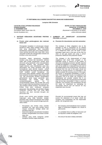 The original consolidated financial statements included hereinare in the Indonesian language.PT PERTAMINA HULU ENERGI DAN ENTITAS ANAK/AND SUBSIDIARIES Lampiran 5/56 ScheduleCATATAN ATAS LAPORAN KEUANGANKONSOLIDASIAN31 DESEMBER 2020(Dinyatakan dalam ribuan dolar AS, kecuali dinyatakan lain)NOTES TO THE CONSOLIDATEDFINANCIAL STATEMENTSDECEMBER 31, 2020(Expressed in thousands of US dollars,unless otherwise stated)3. IKHTISAR KEBIJAKAN AKUNTANSI PENTING(lanjutan)3. SUMMARY OF SIGNIFICANT ACCOUNTINGPOLICIES (continued)m. Provisi untuk pembongkaran dan restorasilokasi asetm. Provision for decomission and site restorationPeningkatan kewajiban ini sehubungan denganberlalunya waktu diakui sebagai beban bunga.Aset yang dikapitalisasi akan disusutkanberdasarkan metode garis lurus selama taksiranmasa manfaat ekonomis atau masa KBH, manayang lebih rendah dan menggunakan metode unitproduksi untuk aset produksi.The increase in these obligations due to thepassage of time is recognized as an interestexpense. The capitalized assets are depreciatedon a straight-line basis over the lesser of theirestimated useful lives or the term of the PSC forother oil and gas assets and using a unit-ofproduction method for the production assets.Perubahan dalam pengukuran kewajibantersebut yang timbul dari perubahan estimasiwaktu atau jumlah pengeluaran sumber dayaekonomis yang diperlukan untuk menyelesaikankewajiban tersebut, atau perubahan dalamtingkat diskonto, akan ditambahkan pada ataudikurangkan dari harga perolehan aset yangbersangkutan pada periode berjalan. Jumlahyang dikurangkan dari harga perolehan aset tidakboleh melebihi jumlah tercatatnya. Jikapenurunan dalam liabilitas melebihi nilai tercatataset, kelebihan tersebut segera diakui dalam labarugi. Jika penyesuaian tersebut menghasilkanpenambahan pada harga perolehan aset,Perusahaan dan Entitas Anak akanmempertimbangkan apakah hal inimengindikasikan bahwa nilai tercatat aset yangbaru mungkin tidak bisa dipulihkan secara penuh.Jika terdapat indikasi tersebut, Perusahaan danEntitas Anak akan melakukan pengujianpenurunan nilai terhadap aset tersebut denganmelakukan estimasi atas nilai yang dapatdipulihkan dan akan mencatat kerugian daripenurunan nilai.The changes in the measurement of theseobligations that result from changes in theestimated timing or amount of the outflow ofresources embodying economic benefits requiredto settle the obligation, or a change in the discountrate will be added to or deducted from the cost ofthe related asset in the current period. The amountdeducted from the cost of the asset should notexceed its carrying amount. If a decrease in theliability exceeds the carrying amount of the asset,the excess is recognized immediately in profit orloss. If the adjustment results in an addition to theacquisition cost of an asset, the Company andSubsidiaries will consider whether this is anindication that the new carrying amount of the assetmay not be fully recoverable. If there is such anindication, the Company and Subsidiaries will testthe asset for impairment by estimating itsrecoverable amount and will account for anyimpairment loss incurred.Provisi untuk hal-hal yang berkaitan denganlingkungan yang tidak berkaitan denganpenarikan aset, dimana Perusahaan dan EntitasAnak merupakan pihak yang bertanggung jawab,diakui ketika:Provision for environmental issues that may notinvolve the retirement of an asset, where theCompany and Subsidiaries are the responsibleparties, are recognized when:- Perusahaan dan Entitas Anak memilikikewajiban kini, baik yang bersifat hukummaupun konstruktif, sebagai akibat dariperistiwa masa lalu;- the Company and Subsidiaries have a presentlegal or constructive obligation as a result ofpast events;- besar kemungkinan penyelesaian kewajibantersebut mengakibatkan arus keluar sumberdaya; dan- it is probable that an outflow of resources willbe required to settle the obligation; and- estimasi yang andal mengenai jumlahkewajiban tersebut dapat ditentukan.- the amount has been reliably estimated.Laporan ManajemenManagement ReportProfil PerusahaanCompany ProfileAnalisa & Diskusi ManajemenManagement Discussion & AnalysisIkhtisar 20202020 HighlightsPT Pertamina Hulu Energi2020 Laporan Tahunan TerintegrasiIntegrated Annual Report 736