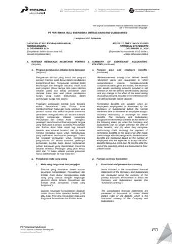 The original consolidated financial statements included hereinare in the Indonesian language.PT PERTAMINA HULU ENERGI DAN ENTITAS ANAK/AND SUBSIDIARIES Lampiran 5/61 ScheduleCATATAN ATAS LAPORAN KEUANGANKONSOLIDASIAN31 DESEMBER 2020(Dinyatakan dalam ribuan dolar AS, kecuali dinyatakan lain)NOTES TO THE CONSOLIDATEDFINANCIAL STATEMENTSDECEMBER 31, 2020(Expressed in thousands of US dollars,unless otherwise stated)3. IKHTISAR KEBIJAKAN AKUNTANSI PENTING(lanjutan)3. SUMMARY OF SIGNIFICANT ACCOUNTINGPOLICIES (continued)o. Program pensiun dan imbalan kerja karyawan(lanjutan)o. Pension plan and employee benefits(continued)Pengukuran kembali yang timbul dari programpensiun manfaat pasti diakui dalam pendapatankomprehensif lain. Pengukuran kembali terdirikeuntungan dan kerugian aktuaria, imbal hasilaset program (diluar bunga neto pada liabilitasimbalan pasti) dan setiap perubahan atasdampak batas atas aset (diluar pendapatanbunga yang sudah diakumulasi dalamperhitungan bunga neto (aset)).Remeasurements arising from defined benefitretirement plans are recognized in othercomprehensive income. Remeasurementscomprise actuarial gains and losses, the return onplan assets (excluding amounts included in netinterest on the net defined benefit liability (asset))and any change in the effect of the asset ceiling(excluding amounts included in net interest on thenet defined benefit liability (asset)).Pesangon pemutusan kontrak kerja terutangketika Perusahaan atau Entitas Anakmemberhentikan hubungan kerja sebelum usiapensiun normal atau ketika karyawan menerimapenawaran mengundurkan diri secara sukareladengan kompensasi imbalan pesangon.Perusahaan dan Entitas Anak mengakuipesangon pemutusan kontrak kerja pada tanggalyang lebih awal di antara: (a) ketika Perusahaandan Entitas Anak tidak dapat lagi menariktawaran atas imbalan tersebut; dan (b) ketikamereka mengakui biaya untuk restrukturisasiyang melibatkan pembayaran pesangon. Dalamhal terdapat penawaran untuk mendorongpengunduran diri secara sukarela, pesangonpemutusan kontrak kerja diukur berdasarkanjumlah karyawan yang diperkirakan menerimatawaran tersebut. Pesangon yang jatuh tempolebih dari 12 bulan setelah periode pelaporanharus didiskontokan ke nilai masa kini.Termination benefits are payable when anemployee%u2019s employment is terminated by theCompany or Subsidiaries before the normalretirement date or whenever an employee acceptsvoluntary redundancy in exchange for thesebenefits. The Company and Subsidiariesrecognize the termination benefits at the earlier ofthe following dates: (a) when the Company andSubsidiaries can no longer withdraw the offer ofthose benefits; and (b) when they recogniserestructuring costs involving the payment oftermination benefits. In the case of an offer madeto encourage voluntary resignation, the terminationbenefits are measured based on the number ofemployees who are expected to accept the offer.Benefits falling due more than 12 months after theend of the reporting period are discounted to theirpresent value.p. Penjabaran mata uang asing p. Foreign currency translationi. Mata uang fungsional dan penyajian i. Functional and presentation currencyPos-pos yang disertakan dalam laporankeuangan konsolidasian Perusahaan danEntitas Anak diukur menggunakan matauang yang sesuai dengan lingkunganekonomi utama dimana Perusahaan danEntitas Anak beroperasi (%u201cmata uangfungsional%u201d).Items included in the consolidated financialstatements of the Company and Subsidiariesare measured using the currency of theprimary economic environment in which theCompany and Subsidiaries operate (the%u201cfunctional currency%u201d).Laporan keuangan konsolidasian disajikandalam ribuan dolar Amerika Serikat (US$atau dolar AS) yang merupakan mata uangfungsional Perusahaan dan Entitas Anak.The consolidated financial statements arepresented in thousands of United Statesdollars (US$ or US dollars), which is thefunctional currency of the Company andSubsidiaries.Tata Kelola Perusahaan yang BaikGood Corporate GovernanceTanggung Jawab Sosial PerusahaanCorporate Social ResponsibilityLaporan Keuangan KonsolidasianConsolidated Financial ReportPT Pertamina Hulu Energi2020 Laporan Tahunan TerintegrasiIntegrated Annual Report 741
