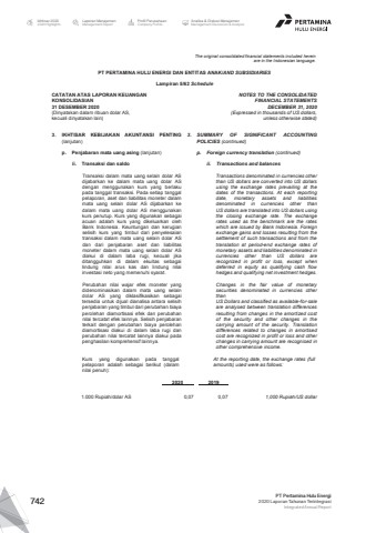 The original consolidated financial statements included hereinare in the Indonesian language.PT PERTAMINA HULU ENERGI DAN ENTITAS ANAK/AND SUBSIDIARIES Lampiran 5/62 ScheduleCATATAN ATAS LAPORAN KEUANGANKONSOLIDASIAN31 DESEMBER 2020(Dinyatakan dalam ribuan dolar AS, kecuali dinyatakan lain)NOTES TO THE CONSOLIDATEDFINANCIAL STATEMENTSDECEMBER 31, 2020(Expressed in thousands of US dollars,unless otherwise stated)3. IKHTISAR KEBIJAKAN AKUNTANSI PENTING(lanjutan)3. SUMMARY OF SIGNIFICANT ACCOUNTINGPOLICIES (continued)p. Penjabaran mata uang asing (lanjutan) p. Foreign currency translation (continued)ii. Transaksi dan saldo ii. Transactions and balancesTransaksi dalam mata uang selain dolar ASdijabarkan ke dalam mata uang dolar ASdengan menggunakan kurs yang berlakupada tanggal transaksi. Pada setiap tanggalpelaporan, aset dan liabilitas moneter dalammata uang selain dolar AS dijabarkan kedalam mata uang dolar AS menggunakankurs penutup. Kurs yang digunakan sebagaiacuan adalah kurs yang dikeluarkan olehBank Indonesia. Keuntungan dan kerugianselisih kurs yang timbul dari penyelesaiantransaksi dalam mata uang selain dolar ASdan dari penjabaran aset dan liabilitasmoneter dalam mata uang selain dolar ASdiakui di dalam laba rugi, kecuali jikaditangguhkan di dalam ekuitas sebagailindung nilai arus kas dan lindung nilaiinvestasi neto yang memenuhi syarat.Transactions denominated in currencies otherthan US dollars are converted into US dollarsusing the exchange rates prevailing at thedates of the transactions. At each reportingdate, monetary assets and liabilitiesdenominated in currencies other thanUS dollars are translated into US dollars usingthe closing exchange rate. The exchangerates used as the benchmark are the rateswhich are issued by Bank Indonesia. Foreignexchange gains and losses resulting from thesettlement of such transactions and from thetranslation at period-end exchange rates ofmonetary assets and liabilities denominated incurrencies other than US dollars arerecognized in profit or loss, except whendeferred in equity as qualifying cash flowhedges and qualifying net investment hedges.Perubahan nilai wajar efek moneter yangdidenominasikan dalam mata uang selaindolar AS yang diklasifikasikan sebagaitersedia untuk dijual dianalisa antara selisihpenjabaran yang timbul dari perubahan biayaperolehan diamortisasi efek dan perubahannilai tercatat efek lainnya. Selisih penjabaranterkait dengan perubahan biaya perolehandiamortisasi diakui di dalam laba rugi danperubahan nilai tercatat lainnya diakui padapenghasilan komprehensif lainnya.Changes in the fair value of monetarysecurities denominated in currencies otherthanUS Dollars and classified as available-for-saleare analysed between translation differencesresulting from changes in the amortized costof the security and other changes in thecarrying amount of the security. Translationdifferences related to changes in amortisedcost are recognized in profit or loss and otherchanges in carrying amount are recognised inother comprehensive income.Kurs yang digunakan pada tanggalpelaporan adalah sebagai berikut (dalamnilai penuh):At the reporting date, the exchange rates (fullamounts) used were as follows:2020 20191.000 Rupiah/dolar AS 0,07 0,07 1,000 Rupiah/US dollarLaporan ManajemenManagement ReportProfil PerusahaanCompany ProfileAnalisa & Diskusi ManajemenManagement Discussion & AnalysisIkhtisar 20202020 HighlightsPT Pertamina Hulu Energi2020 Laporan Tahunan TerintegrasiIntegrated Annual Report 742