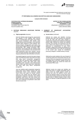The original consolidated financial statements included hereinare in the Indonesian language.PT PERTAMINA HULU ENERGI DAN ENTITAS ANAK/AND SUBSIDIARIES Lampiran 5/64 ScheduleCATATAN ATAS LAPORAN KEUANGANKONSOLIDASIAN31 DESEMBER 2020(Dinyatakan dalam ribuan dolar AS, kecuali dinyatakan lain)NOTES TO THE CONSOLIDATEDFINANCIAL STATEMENTSDECEMBER 31, 2020(Expressed in thousands of US dollars,unless otherwise stated)3. IKHTISAR KEBIJAKAN AKUNTANSI PENTING(lanjutan)3. SUMMARY OF SIGNIFICANT ACCOUNTINGPOLICIES (continued)q. Pajak penghasilan (lanjutan) q. Income taxes (continued)Aset dan liabilitas pajak tangguhan yang berasaldari kegiatan di luar kegiatan KBH dihitungdengan menggunakan tarif pajak yang berlakuatau secara substansial telah berlaku padatanggal laporan posisi keuangan. Untuk aset danliabilitas pajak tangguhan terkait kegiatan KBHdihitung dengan menggunakan tarif pajak yangberlaku pada tanggal efektifnya KBH atau tanggalperpanjangan atau tanggal perubahan KBH.Perubahan nilai tercatat aset dan liabilitas pajaktangguhan yang disebabkan oleh perubahan tarifpajak dibebankan pada tahun berjalan, kecualiuntuk transaksi-transaksi yang sebelumnya telahlangsung dibebankan atau dikreditkan ke ekuitas.Deferred tax assets and liabilities involvingactivities other than PSC activities are measuredat the tax rates that have been enacted orsubstantively enacted at the statement of financialposition date. Deferred tax assets and liabilitiesinvolving PSC activities are measured at the taxrates in effect at the effective dates of the PSCs orextensions or amendments of such PSCs.Changes in deferred tax assets and liabilities as aresult of amendments of tax rates are recognizedin the current year, except for transactionspreviously charged or credited directly to equity.Aset pajak tangguhan yang berhubungan dengansaldo rugi fiskal yang belum digunakan dan biayaKBH yang belum memperoleh penggantian(untuk KBH cost recovery) diakui apabila besarkemungkinan jumlah laba fiskal pada masamendatang akan memadai untuk dikompensasidengan saldo rugi fiskal yang belum digunakandan biaya KBH yang belum memperolehpenggantian.Deferred tax assets relating to the carry forward ofunused tax losses and unrecovered costs (for costrecovery PSC) are recognized to the extent that itis probable that in the future, taxable income willbe available against the unused tax losses andunrecovered PSCs costs.Aset dan liabilitas pajak penghasilan tangguhandapat saling hapus apabila terdapat hak yangberkekuatan hukum untuk melakukan salinghapus antara aset pajak kini dengan liabilitaspajak kini dan apabila aset dan liabilitas pajakpenghasilan tangguhan dikenakan oleh otoritasperpajakan yang sama, baik atas entitas kenapajak yang sama ataupun berbeda dan adanyaniat untuk melakukan penyelesaian saldo-saldotersebut secara neto.Deferred income tax assets and liabilities areoffset when there is a legally enforceable right tooffset current tax assets against current taxliabilities and when the deferred income taxesassets and liabilities relate to income taxes leviedby the same taxation authority for either the sametaxable entity or different taxable entities wherethere is an intention to settle the balances on a netbasis.Laporan ManajemenManagement ReportProfil PerusahaanCompany ProfileAnalisa & Diskusi ManajemenManagement Discussion & AnalysisIkhtisar 20202020 HighlightsPT Pertamina Hulu Energi2020 Laporan Tahunan TerintegrasiIntegrated Annual Report 744