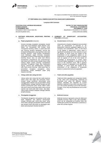 The original consolidated financial statements included hereinare in the Indonesian language.PT PERTAMINA HULU ENERGI DAN ENTITAS ANAK/AND SUBSIDIARIES Lampiran 5/65 ScheduleCATATAN ATAS LAPORAN KEUANGANKONSOLIDASIAN31 DESEMBER 2020(Dinyatakan dalam ribuan dolar AS, kecuali dinyatakan lain)NOTES TO THE CONSOLIDATEDFINANCIAL STATEMENTSDECEMBER 31, 2020(Expressed in thousands of US dollars,unless otherwise stated)3. IKHTISAR KEBIJAKAN AKUNTANSI PENTING(lanjutan)3. SUMMARY OF SIGNIFICANT ACCOUNTINGPOLICIES (continued)q. Pajak penghasilan (lanjutan) q. Income taxes (continued)Koreksi terhadap kewajiban perpajakan dicatatpada saat surat ketetapan pajak diterima, ataudalam hal Perusahaan dan Entitas Anakmengajukan banding, ketika: (1) pada saat hasildari banding tersebut ditetapkan, kecuali bilaterdapat ketidakpastian yang signifikan atas hasilbanding tersebut, maka koreksi berdasarkansurat ketetapan pajak terhadap kewajibanperpajakan tersebut dicatat pada saat pengajuanbanding dibuat, atau (2) pada saat dimanaberdasarkan pengetahuan dari perkembanganatas kasus lain yang serupa dengan kasus yangsedang dalam proses banding, berdasarkanketentuan Pengadilan Pajak atau MahkamahAgung, dimana ada ketidakpastian signifikanatas hasil proses banding, maka pada saat ituperubahan kewajiban perpajakan diakuiberdasarkan jumlah ketetapan pajak yangdiajukan banding.Amendments to taxation obligations are recordedwhen an assessment is received or, forassessment amounts appealed against by theCompany and Subsidiaries, when: (1) the resultof the appeal is determined, unless there issignificant uncertainty as to the outcome of suchan appeal, in which event the impact of theamendment of tax obligations based on anassessment is recognized at the time of makingsuch an appeal, or (2) at the time based onknowledge of developments in similar casesinvolving matters appealed, in rulings by the TaxCourt or the Supreme Court, that a positiveappeal outcome is adjudged to be significantlyuncertain, in which event the impact of anamendment of tax obligations is recognizedbased on assessment amounts appealed.r. Utang usaha dan utang lain-lain r. Trade and other payablesUtang usaha dan utang lain-lain pada awalnyadiakui pada nilai wajar dan kemudian diukurdengan harga perolehan diamortisasi yangmenggunakan metode suku bunga efektif. Utangdiklasifikasikan sebagai liabilitas jangka pendekapabila pembayaran jatuh tempo dalam waktusatu tahun atau kurang (atau dalam siklus normaloperasi dari bisnis jika lebih lama). Jika tidak,utang usaha tersebut disajikan sebagai liabilitasjangka panjang.Trade and other payables are recognized initiallyat fair value and subsequently measured atamortized cost using the effective interestmethod. Payables are classified as currentliabilities if payment is due within one year or less(or in the normal operating cycle of the business,if longer). If not, they are presented as non-currentliabilities.s. Pendapatan tangguhan s. Deferred revenuePendapatan tangguhan merupakan jumlah yangtelah ditagihkan dan diterima sehubungandengan transaksi gas %u201cambil atau bayar%u201d yangakan diakui sebagai pendapatan ketika kuantitasgas tersebut telah dikirimkan ke pelanggan ataupada saat perjanjian tersebut berakhir.Deferred revenue represents amounts billed andcollected involving %u201ctake or pay%u201d gas quantities,which will be recognized as revenue when therelated gas quantity are delivered to customers orwhen the contract expires.Tata Kelola Perusahaan yang BaikGood Corporate GovernanceTanggung Jawab Sosial PerusahaanCorporate Social ResponsibilityLaporan Keuangan KonsolidasianConsolidated Financial ReportPT Pertamina Hulu Energi2020 Laporan Tahunan TerintegrasiIntegrated Annual Report 745