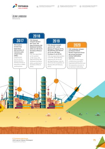 Tata Kelola Perusahaan yang BaikGood Corporate GovernanceTanggung Jawab Sosial PerusahaanCorporate Social ResponsibilityLaporan Keuangan KonsolidasianConsolidated Financial ReportPT Pertamina Hulu Energi2020 Laporan Tahunan TerintegrasiIntegrated Annual Report 75Jejak langkahMilestonePHE ditunjuk menjadi operator WK Jambi Merang (9 Februari 2019), WK Maratua (28 Februari 2019) dan WK Raja/Pendopo (5 Juli 2019).PHE was appointed operator of the WK Jambi Merang (February 09, 2019) and WK Raja/Pendopo (July 05, 2019) and the acquisition of Maratua WK (28 February 2019).PHE melakukan tahapan penetapan bilahan Struktur Organisasi Dasar dan proses persiapan menuju Subholding Upstream.PHE performs the stages of determining the Basic Organizational Structure and the preparation process to be Upstream Subholding.Menerapkan kontrak bagi hasil Gross Split pertama di Indonesia pada wilayah kerja ONWJ.Implemented the first Gross Split production sharing contract in Indonesia in ONWJ working areas.PHE ditunjuk menjadi operator WK Tuban, WK Ogan Komering, WK Southeast Sumatra (SES) dan WK North Sumatera Offshore (NSO).PHE was appointed as the operator of WK Tuban, WK Ogan Komering, WK Southeast Sumatera (SES) and WK North Sumatera Offshore (NSO).2019202020172018