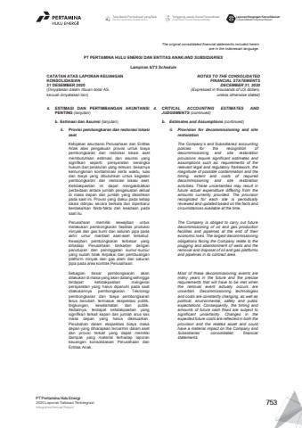 The original consolidated financial statements included hereinare in the Indonesian language.PT PERTAMINA HULU ENERGI DAN ENTITAS ANAK/AND SUBSIDIARIES Lampiran 5/73 ScheduleCATATAN ATAS LAPORAN KEUANGANKONSOLIDASIAN31 DESEMBER 2020(Dinyatakan dalam ribuan dolar AS, kecuali dinyatakan lain)NOTES TO THE CONSOLIDATEDFINANCIAL STATEMENTSDECEMBER 31, 2020(Expressed in thousands of US dollars,unless otherwise stated)4. ESTIMASI DAN PERTIMBANGAN AKUNTANSIPENTING (lanjutan)4. CRITICAL ACCOUNTING ESTIMATES ANDJUDGEMENTS (continued)b. Estimasi dan Asumsi (lanjutan) b. Estimates and Assumptions (continued)ii. Provisi pembongkaran dan restorasi lokasiasetii. Provision for decommissioning and siterestorationKebijakan akuntansi Perusahaan dan EntitasAnak atas pengakuan provisi untuk biayapembongkaran dan restorasi lokasi asetmembutuhkan estimasi dan asumsi yangsignifikan seperti: persyaratan kerangkahukum dan peraturan yang relevan, besarnyakemungkinan kontaminasi serta waktu, luasdan biaya yang dibutuhkan untuk kegiatanpembongkaran dan restorasi lokasi aset.Ketidakpastian ini dapat mengakibatkanperbedaan antara jumlah pengeluaran aktualdi masa depan dari jumlah yang disisihkanpada saat ini. Provisi yang diakui pada setiaplokasi ditinjau secara berkala dan diperbaruiberdasarkan fakta-fakta dan keadaan padasaat itu.The Company%u2019s and Subsidiaries%u2019 accountingpolicies for the recognition ofdecommissioning and site restorationprovisions require significant estimates andassumptions such as: requirements of therelevant legal and regulatory framework, themagnitude of possible contamination and thetiming, extent and costs of requireddecommissioning and site restorationactivities. These uncertainties may result infuture actual expenditure differing from theamounts currently provided. The provisionrecognized for each site is periodicallyreviewed and updated based on the facts andcircumstances available at the time.Perusahaan memiliki kewajiban untukmelakukan pembongkaran fasilitas produksiminyak dan gas bumi dan saluran pipa padaakhir umur manfaat aset-aset tersebut.Kewajiban pembongkaran terbesar yangdihadapi Perusahaan berkaitan denganpenutupan dan peninggalan sumur-sumuryang sudah tidak terpakai dan pembuanganplatform minyak dan gas alam dan saluranpipa pada area kontrak Perusahaan.The Company is obliged to carry out futuredecommissioning of oil and gas productionfacilities and pipelines at the end of theireconomic lives. The largest decommissioningobligations facing the Company relate to theplugging and abandonment of wells and theremoval and disposal of oil and gas platformsand pipelines in its contract area.Sebagian besar pembongkaran akandilakukan di masa yang akan datang sehinggaterdapat ketidakpastian mengenaipersyaratan yang harus dipenuhi pada saatdilakukannya pembongkaran. Teknologipembongkaran dan biaya pembongkaranterus berubah, termasuk ekspektasi politik,lingkungan, keselamatan dan publik.Akibatnya, terdapat ketidakpastian yangsignifikan terkait kapan dan jumlah arus kasmasa depan yang harus dikeluarkan.Perubahan dalam ekspektasi biaya masadepan yang diharapkan tercermin dalam asetdan provisi terkait yang dapat memilikidampak yang material terhadap laporankeuangan konsolidasian Perusahaan danEntitas Anak.Most of these decommissioning events aremany years in the future and the preciserequirements that will have to be met whenthe removal event actually occurs areuncertain. Decommissioning technologiesand costs are constantly changing, as well aspolitical, environmental, safety and publicexpectations. Consequently, the timing andamounts of future cash flows are subject tosignificant uncertainty. Changes in theexpected future costs are reflected in both theprovision and the related asset and couldhave a material impact on the Company andSubsidiaries%u2019 consolidated financialstatements.Tata Kelola Perusahaan yang BaikGood Corporate GovernanceTanggung Jawab Sosial PerusahaanCorporate Social ResponsibilityLaporan Keuangan KonsolidasianConsolidated Financial ReportPT Pertamina Hulu Energi2020 Laporan Tahunan TerintegrasiIntegrated Annual Report 753