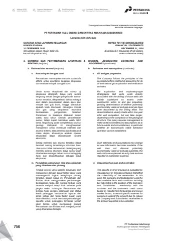 The original consolidated financial statements included hereinare in the Indonesian language.PT PERTAMINA HULU ENERGI DAN ENTITAS ANAK/AND SUBSIDIARIES Lampiran 5/76 ScheduleCATATAN ATAS LAPORAN KEUANGANKONSOLIDASIAN31 DESEMBER 2020(Dinyatakan dalam ribuan dolar AS, kecuali dinyatakan lain)NOTES TO THE CONSOLIDATEDFINANCIAL STATEMENTSDECEMBER 31, 2020(Expressed in thousands of US dollars,unless otherwise stated)4. ESTIMASI DAN PERTIMBANGAN AKUNTANSIPENTING (lanjutan)4. CRITICAL ACCOUNTING ESTIMATES ANDJUDGEMENTS (continued)b. Estimasi dan asumsi (lanjutan) b. Estimates and assumptions (continued)v. Aset minyak dan gas bumi v. Oil and gas propertiesPerusahaan menerapkan metode successfulefforts untuk akuntansi kegiatan eksplorasidan evaluasi minyak dan gas bumi.The Company follows the principles of thesuccessful efforts method of accounting for itsoil and natural gas exploration and evaluationactivities.Untuk sumur eksplorasi dan sumur ujieksplorasi stratigrafi, biaya yang secaralangsung terkait dengan pengeboran sumursumur tersebut, dikapitalisasi dahulu sebagaiaset dalam penyelesaian dalam akun asetminyak dan gas bumi, hingga ditentukanapakah telah ditemukan cadangan minyakdan gas yang berpotensi ekonomisberdasarkan pengeboran tersebut.Penentuan ini biasanya dilakukan dalamwaktu satu tahun setelah penyelesaiansumur, tetapi dapat memakan waktu lebihlama, tergantung pada kompleksitas strukturgeologi. Kebijakan ini mengharuskanmanajemen untuk membuat estimasi danasumsi tertentu atas peristiwa dan keadaan dimasa depan, khususnya apakah operasieksploitasi dapat dilaksanakan secaraekonomis.For exploration and exploratory-typestratigraphic test wells, costs directlyassociated with the drilling of those wells areinitially capitalized as assets underconstruction within oil and gas properties,pending determination of whether potentiallyeconomically viable oil and gas reserves havebeen discovered by the drilling effort. Thedetermination is usually made within one yearafter well completion, but can take longer,depending on the complexity of the geologicalstructure. This policy requires management tomake certain estimates and assumptions as tofuture events and circumstances, in particularwhether an economically viable extractionoperation can be established.Setiap estimasi dan asumsi tersebut dapatberubah seiring tersedianya informasi baru.Jika sumur tidak menemukan cadangan yangmemiliki potensi ekonomi, biaya sumur akandibebankan sebagai beban sumur kering (dryhole) dan diklasifikasikan sebagai biayaeksplorasi.Such estimates and assumptions may changeas new information becomes available. If thewell does not discover potentiallyeconomically viable oil and gas quantities, thewell costs are expensed as a dry hole and arereported in exploration expense.vi. Penyisihan penurunan nilai atas pinjamanyang diberikan dan piutangvi. Impairment on loan and receivableTingkat provisi yang spesifik dievaluasi olehmanajemen dengan dasar faktor-faktor yangmemengaruhi tingkat tertagihnya piutangtersebut. Dalam kasus ini, Perusahaan danEntitas Anak menggunakan pertimbanganberdasarkan fakta dan kondisi terbaik yangtersedia meliputi tetapi tidak terbatas padajangka waktu hubungan Perusahaan danEntitas Anak dengan pelanggan dan statuskredit pelanggan berdasarkan laporan daripihak ketiga dan faktor-faktor pasar yangtelah diketahui, untuk mencatat pencadanganspesifik untuk pelanggan terhadap jumlahjatuh tempo untuk mengurangi piutangPerusahaan dan Entitas anak menjadi jumlahyang diharapkan tertagih.The specific level of provision is evaluated bymanagement on the basis of factors that affectthe collectibility of the receivables. In thiscase, the Company and Subsidiaries%u2019 uses thebest available facts and conditions includingbut not limited to the duration of the Companyand Subsidiaries relationship with thecustomer and the customer's credit statusbased on reports from third parties and knownmarket factors, to record specific reserves forcustomers against the amount due to reducethe Company and Subsidiaries%u2019 receivables tothe amount expected to be collected.Laporan ManajemenManagement ReportProfil PerusahaanCompany ProfileAnalisa & Diskusi ManajemenManagement Discussion & AnalysisIkhtisar 20202020 HighlightsPT Pertamina Hulu Energi2020 Laporan Tahunan TerintegrasiIntegrated Annual Report 756