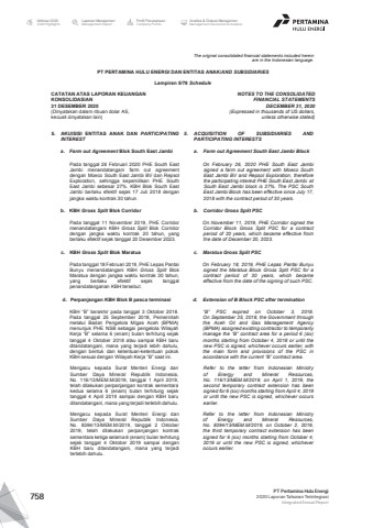 The original consolidated financial statements included hereinare in the Indonesian language.PT PERTAMINA HULU ENERGI DAN ENTITAS ANAK/AND SUBSIDIARIES Lampiran 5/78 ScheduleCATATAN ATAS LAPORAN KEUANGANKONSOLIDASIAN31 DESEMBER 2020(Dinyatakan dalam ribuan dolar AS, kecuali dinyatakan lain)NOTES TO THE CONSOLIDATEDFINANCIAL STATEMENTSDECEMBER 31, 2020(Expressed in thousands of US dollars,unless otherwise stated)5. AKUISISI ENTITAS ANAK DAN PARTICIPATINGINTEREST5. ACQUISITION OF SUBSIDIARIES ANDPARTICIPATING INTERESTSa. Farm out Agreement Blok South East Jambi a. Farm out Agreement South East Jambi BlockPada tanggal 26 Februari 2020 PHE South EastJambi menandatangani farm out agreementdengan Moeco South East Jambi BV dan RepsolExploration, sehingga kepemilikan PHE SouthEast Jambi sebesar 27%. KBH Blok South EastJambi berlaku efektif sejak 17 Juli 2018 denganjangka waktu kontrak 30 tahun.On February 26, 2020 PHE South East Jambisigned a farm out agreement with Moeco SouthEast Jambi BV and Repsol Exploration, thereforethe participating interest PHE South East Jambi atSouth East Jambi block is 27%. The PSC SouthEast Jambi Block has been effective since July 17,2018 with the contract period of 30 years.b. KBH Gross Split Blok Corridor b. Corridor Gross Split PSCPada tanggal 11 November 2019, PHE Corridormenandatangani KBH Gross Split Blok Corridordengan jangka waktu kontrak 20 tahun, yangberlaku efektif sejak tanggal 20 Desember 2023.On November 11, 2019, PHE Corridor signed theCorridor Block Gross Split PSC for a contractperiod of 20 years, which became effective fromthe date of December 20, 2023.c. KBH Gross Split Blok Maratua c. Maratua Gross Split PSC Pada tanggal 18 Februari 2019, PHE Lepas PantaiBunyu menandatangani KBH Gross Split BlokMaratua dengan jangka waktu kontrak 30 tahun,yang berlaku efektif sejak tanggalpenandatanganan KBH tersebut.On February 18, 2019, PHE Lepas Pantai Bunyusigned the Maratua Block Gross Split PSC for acontract period of 30 years, which becameeffective from the date of the signing of such PSC.d. Perpanjangan KBH Blok B pasca terminasi d. Extension of B Block PSC after terminationKBH %u201cB%u201d berakhir pada tanggal 3 Oktober 2018.Pada tanggal 25 September 2018, Pemerintahmelalui Badan Pengelola Migas Aceh (BPMA)menunjuk PHE NSB sebagai pengelola WilayahKerja %u201cB%u201d selama 6 (enam) bulan terhitung sejaktanggal 4 Oktober 2018 atau sampai KBH baruditandatangani, mana yang terjadi lebih dahulu,dengan bentuk dan ketentuan-ketentuan pokokKBH sesuai dengan Wilayah Kerja %u201cB%u201d saat ini.%u201cB%u201d PSC expired on October 3, 2018.On September 25, 2018, the Government throughthe Aceh Oil and Gas Management Agency(BPMA) assigned existing contractor to temporarilymanage the %u201cB%u201d contract area for a period 6 (six)months starting from October 4, 2018 or until thenew PSC is signed, whichever occurs earlier, withthe main form and provisions of the PSC inaccordance with the current %u201cB%u201d contract area.Mengacu kepada Surat Menteri Energi danSumber Daya Mineral Republik Indonesia,No. 116/13/MEM.M/2019, tanggal 1 April 2019,telah dilakukan perpanjangan kontrak sementarakedua selama 6 (enam) bulan terhitung sejaktanggal 4 April 2019 sampai dengan KBH baruditandatangani, mana yang terjadi terlebih dahulu.Refer to the letter from Indonesian Ministryof Energy and Mineral Resources,No. 116/13/MEM.M/2019, on April 1, 2019, thesecond temporary contract extension has beensigned for 6 (six) months starting from April 4, 2019or until the new PSC is signed, whichever occursearlier.Mengacu kepada Surat Menteri Energi danSumber Daya Mineral Republik Indonesia,No. 8394/13/MEM.M/2019, tanggal 2 Oktober2019, telah dilakukan perpanjangan kontraksementara ketiga selama 6 (enam) bulan terhitungsejak tanggal 4 Oktober 2019 sampai denganKBH baru ditandatangani, mana yang terjaditerlebih dahulu.Refer to the letter from Indonesian Ministryof Energy and Mineral Resources,No. 8394/13/MEM.M/2019, on October 2, 2019,the third temporary contract extension has beensigned for 6 (six) months starting from October 4,2019 or until the new PSC is signed, whicheveroccurs earlier.Laporan ManajemenManagement ReportProfil PerusahaanCompany ProfileAnalisa & Diskusi ManajemenManagement Discussion & AnalysisIkhtisar 20202020 HighlightsPT Pertamina Hulu Energi2020 Laporan Tahunan TerintegrasiIntegrated Annual Report 758