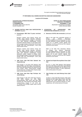 The original consolidated financial statements included hereinare in the Indonesian language.PT PERTAMINA HULU ENERGI DAN ENTITAS ANAK/AND SUBSIDIARIES Lampiran 5/79 ScheduleCATATAN ATAS LAPORAN KEUANGANKONSOLIDASIAN31 DESEMBER 2020(Dinyatakan dalam ribuan dolar AS, kecuali dinyatakan lain)NOTES TO THE CONSOLIDATEDFINANCIAL STATEMENTSDECEMBER 31, 2020(Expressed in thousands of US dollars,unless otherwise stated)5. AKUISISI ENTITAS ANAK DAN PARTICIPATINGINTEREST (lanjutan)5. ACQUISITION OF SUBSIDIARIES ANDPARTICIPATING INTERESTS (continued)d. Perpanjangan KBH Blok B pasca terminasi(lanjutan)d. Extension of B PSC after termination (continued)Mengacu kepada Surat Menteri Energi danSumber Daya Mineral Republik Indonesia,No. 512/13/MEM.M/2019, tanggal 15 November2019, telah dilakukan perpanjangan kontraksementara keempat selama 12 (dua belas) bulanterhitung sejak tanggal 18 November 2019 sampaidengan KBH baru ditandatangani, mana yangterjadi terlebih dahulu.Refer to the letter from Indonesian Ministry ofEnergy and Mineral Resources,No. 512/13/MEM.M/ 2019, on November 15, 2019,the forth temporary contract extension has beensigned for 12 (twelve) months starting fromNovember 18, 2019 or until the new PSC is signed,whichever occurs earlier.Mengacu kepada Surat Menteri Energi danSumber Daya Mineral Republik Indonesia,No. 378/13/MEM.M/2020, tanggal 16 November2020, telah dilakukan perpanjangan kontraksementara kelima selama 6 (enam) bulanterhitung sejak tanggal 18 November 2020 sampaidengan KBH baru ditandatangani, mana yangterjadi terlebih dahulu.Refer to the letter from Indonesian Ministryof Energy and Mineral Resources,No. 378/13/MEM.M/2020, on November 16, 2020,the fifth temporary contract extension has beensigned for 6 (six) months starting fromNovember 18, 2020 or until the new PSC is signed,whichever occurs earlier.e. KBH Gross Split PHE Blok Salawati danKepala Burunge. Salawati and Kepala Burung Block Gross SplitPSCPada tanggal 11 Juli 2018, PHE Salawati, PHESalawati Basin dan SKK Migas menandatanganiKBH Gross Split Blok Salawati dan Kepala Burungyang berlaku efektif masing-masing tanggal22 April 2020 dan 15 Oktober 2020 dengan jangkawaktu kontrak selama 20 tahun.On July 11, 2018, PHE Salawati, PHE SalawatiBasin and SKK Migas signed Gross Split Salawatiand Kepala Burung Block with the effective fromApril 22, 2020 and October 15, 2020, respectively,with contract period of 20 years.f. KBH Gross Split Blok Raja Pendopo danJambi Merangf. Raja Pendopo and Jambi Merang Gross SplitPSCPada tanggal 31 Mei 2018, PHE Raja Tempirai,PHE Jambi Merang dan SKK Migasmenandatangani KBH Gross Split Blok RajaPendopo dan Jambi Merang yang berlaku efektifmasing-masing tanggal 6 Juli 2019 dan10 Februari 2019 dengan jangka waktu kontrakselama 20 tahun.On May 31, 2018, PHE Raja Tempirai, PHE JambiMerang and SKK Migas signed Gross Split RajaPendopo and Jambi Merang Block with theeffective from July 6, 2019 and February 10, 2019,respectively, with contract period of 20 years.Tata Kelola Perusahaan yang BaikGood Corporate GovernanceTanggung Jawab Sosial PerusahaanCorporate Social ResponsibilityLaporan Keuangan KonsolidasianConsolidated Financial ReportPT Pertamina Hulu Energi2020 Laporan Tahunan TerintegrasiIntegrated Annual Report 759