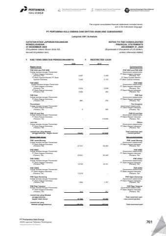 The original consolidated financial statements included hereinare in the Indonesian language.PT PERTAMINA HULU ENERGI DAN ENTITAS ANAK/AND SUBSIDIARIES Lampiran 5/81 ScheduleCATATAN ATAS LAPORAN KEUANGANKONSOLIDASIAN31 DESEMBER 2020(Dinyatakan dalam ribuan dolar AS, kecuali dinyatakan lain)NOTES TO THE CONSOLIDATEDFINANCIAL STATEMENTSDECEMBER 31, 2020(Expressed in thousands of US dollars,unless otherwise stated)7. KAS YANG DIBATASI PENGGUNAANNYA 7. RESTRICTED CASH2020 2019Bagian lancar Current portionPHE NSO dan PHE NSB PHE NSO and PHE NSBEntitas berelasi dengan Pemerintah Government related entity- PT Bank Negara Indonesia PT Bank Negara Indonesia -(Persero) Tbk. 2.487 2.456 (Persero) Tbk.- PT Bank Syariah Mandiri/ PT Bank PT Bank Syariah Mandiri/ -Syariah Indonesia. 7.442 5.137 PT Bank Syariah Indnesia.PHE WMO PHE WMOEntitas berelasi dengan Pemerintah Government related entity- PT Bank Negara Indonesia PT Bank Negara Indonesia -(Persero) Tbk. 5.304 2.508 (Persero) Tbk.- PT Bank Rakyat Indonesia PT Bank Rakyat Indonesia -(Persero) Tbk. 2.494 450 (Persero) Tbk.PHE Siak PHE SiakEntitas berelasi dengan Pemerintah Government related entity- PT Bank Rakyat Indonesia PT Bank Rakyat Indonesia -(Persero) Tbk. 689 578 (Persero) Tbk.Perusahaan The CompanyEntitas berelasi dengan Pemerintah Government related entity- PT Bank Rakyat Indonesia PT Bank Rakyat Indonesia -(Persero) Tbk. 5 505 (Persero) Tbk.PHE Oil and Gas PHE Oil and GasEntitas berelasi dengan Pemerintah Government related entity- PT Bank Rakyat Indonesia PT Bank Rakyat Indonesia -(Persero) Tbk. - 110.000 (Persero) Tbk.Lain-lain OthersEntitas berelasi dengan Pemerintah Government related entity- PT Bank Rakyat Indonesia PT Bank Rakyat Indonesia -(Persero) Tbk. - 1 (Persero) Tbk.Jumlah kas yang dibatasi Total restricted cashpenggunaannya - bagian lancar 18.421 121.635 - current portionBagian tidak lancar Non-current portionPHE Jambi Merang PHE Jambi MerangEntitas berelasi dengan Pemerintah Government related entity- PT Bank Rakyat Indonesia PT Bank Rakyat Indonesia -(Persero) Tbk. 27.321 26.400 (Persero) Tbk.PHE WMO PHE WMOEntitas berelasi dengan Pemerintah Government related entity- PT Bank Negara Indonesia PT Bank Negara Indonesia -(Persero) Tbk. 23.941 20.449 (Persero) Tbk.PHE ONWJ PHE ONWJEntitas berelasi dengan Pemerintah Government related entity- PT Bank Negara Indonesia PT Bank Negara Indonesia -(Persero) Tbk. 18.722 16.191 (Persero) Tbk.PHE OSES PHE OSESEntitas berelasi dengan Pemerintah Government related entity- PT Bank Negara Indonesia PT Bank Negara Indonesia -(Persero) Tbk. 15.219 - (Persero) Tbk.PHE Ogan Komering PHE Ogan KomeringEntitas berelasi dengan Pemerintah Government related entity- PT Bank Rakyat Indonesia PT Bank Rakyat Indonesia -(Persero) Tbk. 1.894 1.737 (Persero) Tbk.PHE Raja Tempirai PHE Raja TempiraiEntitas berelasi dengan Pemerintah Government related entity- PT Bank Negara Indonesia PT Bank Negara Indonesia -(Persero) Tbk. 843 831 (Persero) Tbk.Jumlah kas yang dibatasipenggunaannya - Total restricted cashbagian tidak lancar 87.940 65.608 - non-current portionJumlah kas yangdibatasi penggunaannya 106.361 187.243 Total restricted cashTata Kelola Perusahaan yang BaikGood Corporate GovernanceTanggung Jawab Sosial PerusahaanCorporate Social ResponsibilityLaporan Keuangan KonsolidasianConsolidated Financial ReportPT Pertamina Hulu Energi2020 Laporan Tahunan TerintegrasiIntegrated Annual Report 761