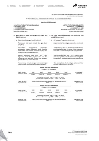 The original consolidated financial statements included hereinare in the Indonesian language.PT PERTAMINA HULU ENERGI DAN ENTITAS ANAK/AND SUBSIDIARIES Lampiran 5/88 ScheduleCATATAN ATAS LAPORAN KEUANGANKONSOLIDASIAN31 DESEMBER 2020(Dinyatakan dalam ribuan dolar AS, kecuali dinyatakan lain)NOTES TO THE CONSOLIDATEDFINANCIAL STATEMENTSDECEMBER 31, 2020(Expressed in thousands of US dollars,unless otherwise stated)14. ASET MINYAK DAN GAS BUMI dan ASET HAKGUNA (lanjutan)14. OIL AND GAS PROPERTIES and RIGHT OF USEASSETS (continued)a. Aset minyak dan gas bumi (lanjutan) a. Oil and gas Properties (continued)Penurunan nilai aset minyak dan gas bumi(lanjutan)Impairment of oil and gas properties (continued)Perusahaan menggunakan pendekatanpendapatan (income approach) yang diprediksiberdasarkan nilai arus kas masa depan yang akandihasilkan oleh usaha kedepannya.The Company used an income approach which ispredicted based upon the value of the future cashflows that a business will generate going forward.Metode discounted cash flow (%u201cDCF%u201d) yangdigunakan melibatkan proyeksi arus kas danperubahan nilai arus kas menjadi nilai sekarang(%u201cPresent Value%u201d) melalui diskonto.The discounted cash flow (%u201cDCF%u201d) method usedinvolved projecting cash flows and converting theminto a present value equivalent through discounting.Asumsi harga minyak dan gas bumi serta tingkatdiskonto yang digunakan adalah sebagai berikut:The assumptions of oil and gas prices and thediscount rates used are as follows:Asumsi 2020/2020 AssumptionsProyeksi ICP/ICP ProjectionHarga minyak/barel -nilai penuh2021 2022 2023 2024 2025 Oil price/barrel -full amount US$45 US$52,92 US$54,75 US$56,57 US$59,77Selanjutnya bertambah US$1,8 - US$5,2 per tahun/Subsequently increases by US$1.8 - US$5.2 per annumHarga gas bumi Sesuai kontrak penjualan gas/Based on the gas sales agreements Natural gas priceTingkat diskonto 8.30% p.a. Discount rateAsumsi 2019/2019 AssumptionsProyeksi ICP/ICP ProjectionHarga minyak/barel -nilai penuh2020 2021 2022 2023 2024 Oil price/barrel -full amount US$58,4 US$58,8 US$61,4 US$61,7 US$63,1Selanjutnya bertambah US$1,6 - US$1,8 per tahun/Subsequently increases by US$1.6 - US$1.8 per annumHarga gas bumi Sesuai kontrak penjualan gas/Based on the gas sales agreements Natural gas priceTingkat diskonto 7.89% p.a. Discount rateLaporan ManajemenManagement ReportProfil PerusahaanCompany ProfileAnalisa & Diskusi ManajemenManagement Discussion & AnalysisIkhtisar 20202020 HighlightsPT Pertamina Hulu Energi2020 Laporan Tahunan TerintegrasiIntegrated Annual Report 768