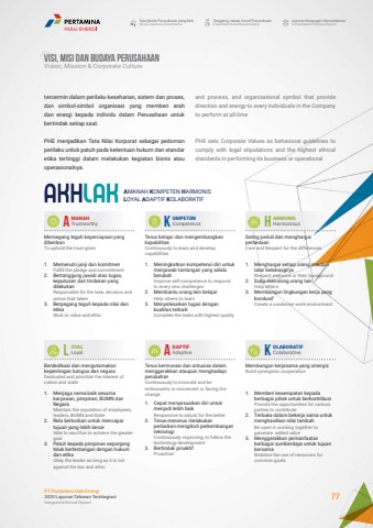 Tata Kelola Perusahaan yang BaikGood Corporate GovernanceTanggung Jawab Sosial PerusahaanCorporate Social ResponsibilityLaporan Keuangan KonsolidasianConsolidated Financial ReportPT Pertamina Hulu Energi2020 Laporan Tahunan TerintegrasiIntegrated Annual Report 77ALKAHKtercermin dalam perilaku keseharian, sistem dan proses, dan simbol-simbol organisasi yang memberi arah dan energi kepada individu dalam Perusahaan untuk bertindak setiap saat. PHE menjadikan Tata Nilai Korporat sebagai pedoman perilaku untuk patuh pada ketentuan hukum dan standar etika tertinggi dalam melakukan kegiatan bisnis atau operasionalnya.and process, and organizational symbol that provide direction and energy to every individuals in the Company to perform at all time PHE sets Corporate Values as behavioral guidelines to comply with legal stipulations and the highest ethical standards in performing its business or operationalMemegang teguh kepercayaan yang diberikanTo uphold the trust givenBerdedikasi dan mengutamakan kepentingan bangsa dan negaraDedicated and prioritize the interest of nation and stateTerus belajar dan mengembangkan kapabilitasContinuously to learn and develop capabilitiesTerus berinovasi dan antusias dalam menggerakkan ataupun menghadapi perubahanContinuously to innovate and be enthusiastic in movement or facing the changeSaling peduli dan menghargai perbedaan Care and Respect for the differences Membangun kerjasama yang sinergisBuild synergistic cooperation1. Memenuhi janji dan komitmenFulfill the pledge and commitment2. Bertanggung jawab atas tugas, keputusan dan tindakan yang dilakukan Responsible for the task, decision and action that taken3. Berpegang teguh kepada nilai dan etika Stick to value and ethic1. Menjaga nama baik sesama karyawan, pimpinan, BUMN dan NegaraMaintain the reputation of employees, leaders, BUMN and State 2. Rela berkorban untuk mencapai tujuan yang lebih besarAble to sacrifice to achieve the greater goal3. Patuh kepada pimpinan sepanjang tidak bertentangan dengan hukum dan etikaObey the leader as long as it is not against the law and ethic1. Meningkatkan kompetensi diri untuk menjawab tantangan yang selalu berubah Improve self-competence to respond to every new challenges2. Membantu orang lain belajar Help others to learn3. Menyelesaikan tugas dengan kualitas terbaik Complete the tasks with highest quality1. Cepat menyesuaikan diri untuk menjadi lebih baik Responsive to adjust for the better 2. Terus-menerus melakukan perbaikan mengikuti perkembangan teknologi Continuously improving, to follow the technology development 3. Bertindak proaktifProactive1. Menghargai setiap orang ataupun latar belakangnya Respect everyone or their background2. Suka menolong orang lain Help others3. Membangun lingkungan kerja yang kondusifCreate a conducive work environment1. Memberi kesempatan kepada berbagai pihak untuk berkontribusi Provide the opportunities for various parties to contribute2. Terbuka dalam bekerja sama untuk menghasilkan nilai tambah Be open in working together to generate added value 3. Menggerakkan pemanfaatan berbagai sumberdaya untuk tujuan bersamaMobilize the use of resources for common goalsVISI, MISI DAN BUDAYA PERUSAHAANVision, Mission & Corporate CultureAMANAH KOMPETEN HARMONISLOYAL ADAPTIF KOLABORATIFMANAHTrustworthyOYALLoyalOMPETENCompetenceDAPTIFAdaptiveARMONISHarmoniousOLABORATIFColaborative