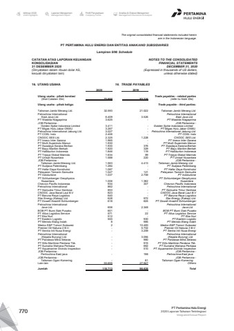 The original consolidated financial statements included hereinare in the Indonesian language.PT PERTAMINA HULU ENERGI DAN ENTITAS ANAK/AND SUBSIDIARIES Lampiran 5/90 ScheduleCATATAN ATAS LAPORAN KEUANGANKONSOLIDASIAN31 DESEMBER 2020(Dinyatakan dalam ribuan dolar AS, kecuali dinyatakan lain)NOTES TO THE CONSOLIDATEDFINANCIAL STATEMENTSDECEMBER 31, 2020(Expressed in thousands of US dollars,unless otherwise stated)16. UTANG USAHA 16. TRADE PAYABLES2020 2019Utang usaha - pihak berelasi Trade payables - related parties(lihat Catatan 33e) 73.600 83.216 (refer to Note 33e)Utang usaha - pihak ketiga: Trade payable - third parties:Talisman Jambi Merang Ltd. 32.593 21.022 Talisman Jambi Merang Ltd.Petrochina International Petrochina InternationalEast Java Ltd. 6.409 3.526 East Java Ltd.PT Waskita Niagaprima 3.625 - PT Waskita NiagaprimaJOB Pertamina - JOB Pertamina -Golden Spike Indonesia Limited 3.411 - Golden Spike Indonesia LimitedPT Migas Hulu Jabar ONWJ 3.267 - PT Migas Hulu Jabar ONWJ.Petrochina International Jabung Ltd. 3.027 - Petrochina International Jabung Ltd.PT COSL Indo 2.406 - PT COSL IndoCNOOC SES Ltd. 2.325 1.228 CNOOC SES Ltd.PT Imeco Inter Sarana 1.965 - PT Imeco Inter SaranaPT Multi Superindo Manun 1.930 - PT Multi Superindo ManunPT Swadaya Sarana Berlian 1.930 376 PT Swadaya Sarana BerlianPT Bayu Maritim Berkah 1.920 329 PT Bayu Maritim BerkahPT Halliburton Indonesia 1.846 119 PT Halliburton IndonesiaPT Trijaya Global Marindo 1.634 89 PT Trijaya Global MarindoPT Unisat Nusantara 1.588 220 PT Unisat NusantaraJOB Pertamina - JOB Pertamina -Talisman Jambi Merang Ltd. 1.563 4.413 Talisman Jambi Merang Ltd.PT Sudjaca Palembang 1.284 - PT Sudjaca PalembangPT Hafar Daya Konstruksi 1.087 - PT Hafar Daya KonstruksiPelayaran Tamarin Samudra 1.047 121 Pelayaran Tamarin SamudraPT Indoturbine 1.037 2.759 PT IndoturbinePT Schlumberger Geophysics PT Schlumberger Geophysics Nusantara 1.006 1.382 NusantaraChevron Pacific Indonesia 934 337 Chevron Pacific IndonesiaPetrochina International 862 - Petrochina InternationalPT Samudra Timur Santosa 853 - PT Samudra Timur SantosaCNOOC Java Barat Laut B.V 823 - CNOOC Java Barat Laut B.VPT Baruna Raya Logistics 640 - PT Baruna Raya LogisticsStar Energy (Kakap) Ltd. 628 972 Star Energy (Kakap) Ltd.PT Dowell Anadrill Schlumberger 618 626 PT Dowell Anadrill SchlumbergerPetrochina International Petrochina InternationalJava Ltd. 606 2.348 Java Ltd.BOB PT Bumi Siak Pusako 601 - BOB PT Bumi Siak PusakoPT Altus Logistics Service 571 22 PT Altus Logistics ServicePT Eka Nuri 512 - PT Eka NuriPT Eastern Logistic 500 930 PT Eastern LogisticPT Meindo Elang Indah 8 985 PT Meindo Elang IndahMedco E&P Tomori Sulawesi 2 10.483 Medco E&P Tomori SulawesiPremier Oil Natuna 2 B.V. - 5.702 Premier Oil Natuna 2 B.V.PT Sentra Inti Nusa Energi - 3.259 PT Sentra Inti Nusa EnergiPetrochina International Petrochina International(Kepala Burung) Ltd. - 3.084 (Kepala Burung) Ltd.PT Pandawa Mitra Selaras - 980 PT Pandawa Mitra SelarasPT Sillo Maritime Perdana Tbk. - 915 PT Sillo Maritime Perdana Tbk.PT Sumatra Wahana Perkasa - 662 PT Sumatra Wahana PerkasaPT Aquamarine Divindo Inspection - 510 PT Aquamarine Divindo InspectionJOB Pertamina - JOB Pertamina -Pertrochina East java - 198 Pertrochina East javaJOB Pertamina - JOB Pertamina -Talisman Ogan Komering - 81 Talisman Ogan KomeringLain-lain 30.655 27.947 OthersJumlah 115.713 95.625 TotalLaporan ManajemenManagement ReportProfil PerusahaanCompany ProfileAnalisa & Diskusi ManajemenManagement Discussion & AnalysisIkhtisar 20202020 HighlightsPT Pertamina Hulu Energi2020 Laporan Tahunan TerintegrasiIntegrated Annual Report 770