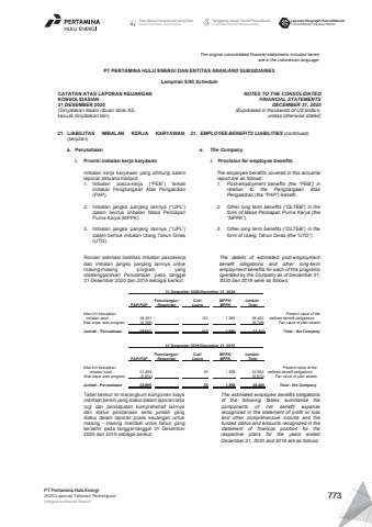 The original consolidated financial statements included hereinare in the Indonesian language.PT PERTAMINA HULU ENERGI DAN ENTITAS ANAK/AND SUBSIDIARIES Lampiran 5/93 ScheduleCATATAN ATAS LAPORAN KEUANGANKONSOLIDASIAN31 DESEMBER 2020(Dinyatakan dalam ribuan dolar AS, kecuali dinyatakan lain)NOTES TO THE CONSOLIDATEDFINANCIAL STATEMENTSDECEMBER 31, 2020(Expressed in thousands of US dollars,unless otherwise stated)21. LIABILITAS IMBALAN KERJA KARYAWAN(lanjutan)21. EMPLOYEE BENEFITS LIABILITIES (continued)a. Perusahaan a. The Companyi. Provisi imbalan kerja karyawan i. Provision for employee benefitsImbalan kerja karyawan yang dihitung dalamlaporan aktuaria meliputi:1. Imbalan pasca-kerja (%u201cPEB%u201d) terkaitimbalan Penghargaan Atas Pengabdian(PAP).2. Imbalan jangka panjang lainnya (%u201cIJPL%u201d)dalam bentuk imbalan Masa PersiapanPurna Karya (MPPK).3. Imbalan jangka panjang lainnya (%u201cIJPL%u201d)dalam bentuk imbalan Ulang Tahun Dinas(UTD).The employee benefits covered in this actuarialreport are as follows:1. Post-employment benefits (the %u201cPEB%u201d) inrelation to the Penghargaan AtasPengabdian (the %u201cPAP%u201d) benefit.2. Other long term benefits (%u201cOLTEB%u201d) in theform of Masa Persiapan Purna Karya (the%u201cMPPK%u201d).3. Other long term benefits (%u201cOLTEB%u201d) in theform of Ulang Tahun Dinas (the %u201cUTD%u201d).Rincian estimasi liabilitas imbalan pascakerjadan imbalan jangka panjang lainnya untukmasing-masing program yangdiselenggarakan Perusahaan pada tanggal31 Desember 2020 dan 2019 sebagai berikut:The details of estimated post-employmentbenefit obligations and other long-termemployment benefits for each of the programsoperated by the Company as of December 31,2020 dan 2019 were as follows:31 Desember 2020/December 31, 2020Pemulangan/ Cuti/ MPPK/ Jumlah/PAP/PAP Repatriasi Leave MPPK TotalNilai kini kewajiban Present value of theimbalan pasti 36.381 - 123 1.956 38.460 defined benefit obligationsNilai wajar aset program (6.748) - - - (6.748) Fair value of plan assetsJumlah - Perusahaan 29.633 - 123 1.956 31.712 Total - the Company31 Desember 2019/December 31, 2019Pemulangan/ Cuti/ MPPK/ Jumlah/PAP/PAP Repatriasi Leave MPPK TotalNilai kini kewajiban Present value of theimbalan pasti 31.869 - 55 1.958 33.882 defined benefit obligationsNilai wajar aset program (5.874) - - - (5.874) Fair value of plan assetsJumlah - Perusahaan 25.995 - 55 1.958 28.008 Total - the CompanyTabel berikut ini merangkum komponen biayamanfaat bersih yang diakui dalam laporan labarugi dan pendapatan komprehensif lainnyadan status pendanaan serta jumlah yangdiakui dalam laporan posisi keuangan untukmasing - masing manfaat untuk tahun yangberakhir pada tanggal-tanggal 31 Desember2020 dan 2019 sebagai berikut:The estimated employee benefits obligationsof the following tables summarise thecomponents of net benefit expenserecognized in the statement of profit or lossand other comprehensive income and thefunded status and amounts recognized in thestatement of financial position for therespective plans for the years endedDecember 31, 2020 and 2019 are as follows:Tata Kelola Perusahaan yang BaikGood Corporate GovernanceTanggung Jawab Sosial PerusahaanCorporate Social ResponsibilityLaporan Keuangan KonsolidasianConsolidated Financial ReportPT Pertamina Hulu Energi2020 Laporan Tahunan TerintegrasiIntegrated Annual Report 773