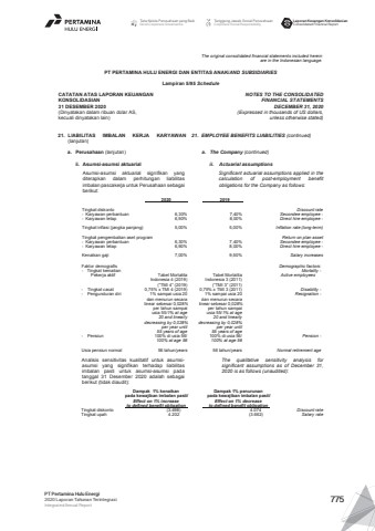 The original consolidated financial statements included hereinare in the Indonesian language.PT PERTAMINA HULU ENERGI DAN ENTITAS ANAK/AND SUBSIDIARIES Lampiran 5/95 ScheduleCATATAN ATAS LAPORAN KEUANGANKONSOLIDASIAN31 DESEMBER 2020(Dinyatakan dalam ribuan dolar AS, kecuali dinyatakan lain)NOTES TO THE CONSOLIDATEDFINANCIAL STATEMENTSDECEMBER 31, 2020(Expressed in thousands of US dollars,unless otherwise stated)21. LIABILITAS IMBALAN KERJA KARYAWAN(lanjutan)21. EMPLOYEE BENEFITS LIABILITIES (continued)a. Perusahaan (lanjutan) a. The Company (continued)ii. Asumsi-asumsi aktuarial ii. Actuarial assumptionsAsumsi-asumsi aktuarial signifikan yangditerapkan dalam perhitungan liabilitasimbalan pascakerja untuk Perusahaan sebagaiberikut:Significant actuarial assumptions applied in thecalculation of post-employment benefitobligations for the Company as follows:2020 2019Tingkat diskonto Discount rate- Karyawan perbantuan 6,30% 7,40% Secondee employee -- Karyawan tetap 6,90% 8,00% Direct hire employee -Tingkat inflasi (jangka panjang) 5,00% 5,00% Inflation rate (long-term)Tingkat pengembalian aset program Return on plan asset- Karyawan perbantuan 6,30% 7,40% Secondee employee -- Karyawan tetap 6,90% 8,00% Direct hire employee -Kenaikan gaji 7,00% 9,50% Salary increasesFaktor demografis Demographic factors:- Tingkat kematian Mortality -Pekerja aktif Tabel Mortalita Tabel Mortalita Active employeesIndonesia 4 (2019) Indonesia 3 (2011)(%u201cTMI 4%u201d (2019) (%u201cTMI 3%u201d (2011)- Tingkat cacat 0,75% x TMI 4 (2019) 0,75% x TMI 3 (2011) Disability -- Pengunduran diri 1% sampai usia 20 1% sampai usia 20 Resignation -dan menurun secara dan menurun secaralinear sebesar 0,028% linear sebesar 0,028%per tahun sampai per tahun sampaiusia 55/1% at age usia 55/1% at age20 and linearly 20 and linearlydecreasing by 0,028% decreasing by 0,028%per year until per year until55 years of age 55 years of age- Pensiun 100% di usia 56/ 100% di usia 56/ Pension -100% at age 56 100% at age 56Usia pensiun normal 56 tahun/years 56 tahun/years Normal retirement ageAnalisis sensitivitas kualitatif untuk asumsiasumsi yang signifikan terhadap liabilitasimbalan pasti untuk asumsi-asumsi padatanggal 31 Desember 2020 adalah sebagaiberikut (tidak diaudit):The qualitative sensitivity analysis forsignificant assumptions as of December 31,2020 is as follows (unaudited):Dampak 1% kenaikan Dampak 1% penurunanpada kewajiban imbalan pasti/ pada kewajiban imbalan pasti/Effect on 1% increase Effect on 1% decreaseto defined benefit obligation to defined benefit obligationTingkat diskonto (3.498) 4.074 Discount rateTingkat upah 4.202 (3.662) Salary rateTata Kelola Perusahaan yang BaikGood Corporate GovernanceTanggung Jawab Sosial PerusahaanCorporate Social ResponsibilityLaporan Keuangan KonsolidasianConsolidated Financial ReportPT Pertamina Hulu Energi2020 Laporan Tahunan TerintegrasiIntegrated Annual Report 775