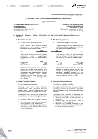 The original consolidated financial statements included hereinare in the Indonesian language.PT PERTAMINA HULU ENERGI DAN ENTITAS ANAK/AND SUBSIDIARIES Lampiran 5/96 ScheduleCATATAN ATAS LAPORAN KEUANGANKONSOLIDASIAN31 DESEMBER 2020(Dinyatakan dalam ribuan dolar AS, kecuali dinyatakan lain)NOTES TO THE CONSOLIDATEDFINANCIAL STATEMENTSDECEMBER 31, 2020(Expressed in thousands of US dollars,unless otherwise stated)21. LIABILITAS IMBALAN KERJA KARYAWAN(lanjutan)21. EMPLOYEE BENEFITS LIABILITIES (continued)b. Perusahaan (lanjutan) b. The Company (continued)ii. Asumsi-asumsi aktuarial (lanjutan) ii. Actuarial assumptions (continued)Durasi rata-rata tahun liabilitas manfaatpascakerja di akhir periode pelaporanPerusahaan adalah sebagai berikut:The average duration years of the Company%u2019sdefined benefits plan obligation at the end ofthe reporting period are as follows:2020 2019PAP 14,14 15,71 PAPJadwal jatuh tempo dari program imbalanpascakerja pada tanggal-tanggal31 Desember 2020 dan 2019 adalah sebagaiberikut:The maturity profile of post-employmentbenefits obligation of the Company as ofDecember 31, 2020 and 2019 are as follows:2020 2019Dalam 1 tahun 5.186 3.732 Within 1 year2-5 tahun 13.693 14.239 2-5 yearsLebih dari 5 tahun 109.763 142.833 More than 5 yearsManajemen berkeyakinan bahwa perkiraanliabilitas dari imbalan kerja karyawan yangdiberikan dari keseluruhan program pensiunPerusahaan, yang didasarkan pada estimasiperhitungan aktuaris, telah melebihikewajiban minimal yang ditentukan olehUndang-Undang KetenagakerjaanNo. 13/2003.Management believes that the estimatedliabilities for employee benefits from all of theGroup%u2019s pension programs, based on theestimated calculation provided by theactuaries, exceed the minimum liability that isrequired by Labour Law No. 13/2003.c. Alokasi Pertamina (Persero) c. Pertamina (Persero) allocationProvisi imbalan kerja karyawan Provision for employee benefitsTerhitung mulai tahun 2020, Pertaminamemberlakukan sistem pencatatan KewajibanImbalan Kerja Pekerja Perbantuannya yangsedang aktif diperbantukan kepada Perusahaan.Starting from 2020, Pertamina has implemented arecording system for its Secondee EmploymentBenefits Obligation that is actively seconded to theCompany.Nilai kewajiban yang dihitung oleh Pertamina dandialokasikan ke Perusahan dihitung berdasarkan:a. Rumusan imbalan yang berlaku di Pertamina.b. Data dan asumsi aktuaria yang digunakandalam pelaporan PSAK 24 Pertamina.c. Terkait disclosure lengkap pekerja perbantuantelah dihitung dan diungkapkan dalam laporanPSAK 24 Pertamina.The liability value calculated by Pertamina andallocated to the Company is calculated based on:a. The formulation of the benefits applicable toPertaminab. Actuarial data and assumptions used inPertamina's PSAK 24 reporting.c. Regarding the complete disclosure of aidworkers, it has been calculated and disclosed inthe PSAK 24 report of Pertamina.Laporan ManajemenManagement ReportProfil PerusahaanCompany ProfileAnalisa & Diskusi ManajemenManagement Discussion & AnalysisIkhtisar 20202020 HighlightsPT Pertamina Hulu Energi2020 Laporan Tahunan TerintegrasiIntegrated Annual Report 776