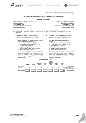 The original consolidated financial statements included hereinare in the Indonesian language.PT PERTAMINA HULU ENERGI DAN ENTITAS ANAK/AND SUBSIDIARIES Lampiran 5/97 ScheduleCATATAN ATAS LAPORAN KEUANGANKONSOLIDASIAN31 DESEMBER 2020(Dinyatakan dalam ribuan dolar AS, kecuali dinyatakan lain)NOTES TO THE CONSOLIDATEDFINANCIAL STATEMENTSDECEMBER 31, 2020(Expressed in thousands of US dollars,unless otherwise stated)21. LIABILITAS IMBALAN KERJA KARYAWAN(lanjutan)21. EMPLOYEE BENEFITS LIABILITIES (continued)d. Alokasi Pertamina (Persero) (lanjutan) d. Pertamina (Persero) allocation (continued)Provisi imbalan kerja karyawan (lanjutan) Provision for employee benefits (continued)Alokasi kewajiban ini meliputi seluruh imbalankerja yang berlaku di Pertamina:i. Dana Pensiun Pertamina (%u201cDPP%u201d).ii. Penghargaan Atas Pengabdian (%u201cPAP%u201d).iii. Kesehatan Pasca Pensiun.iv. Biaya Pemulangan (%u201cRepatriasi%u201d).v. Masa Persiapan Purna Karya (%u201cMPPK%u201d).vi. Ulang Tahun Dinas (%u201cUTD%u201d).This liability allocation covers followingbenefits:i. Dana Pensiun Pertamina (%u201cthe DPP%u201d).ii. Penghargaan Atas Pengabdian (%u201cPAP%u201d).iii. Post Retirement Healthcare.iv. Biaya Pemulangan (%u201cthe Repatriasi%u201d).v. Masa Persiapan Purna Karya.vi. Ulang Tahun Dinas (%u201cthe UTD%u201d).Rincian estimasi liabilitas imbalan pascakerja danimbalan jangka panjang lainnya untuk masingmasing program yang diselenggarakanPerusahaan pada tanggal 31 Desember 2020sebagai berikut:The details of estimated post-employmentbenefit obligations and other long-termemployment benefits for each of the programsoperated by the Company as of December 31,2020 were as follows:TunjanganDPP/DPPPemulangan/RepatriasiCuti/LeaveKesehatan/HealthcarebenefitMPPK/MPPKJumlah/TotalNilai kini kewajiban Present value of theimbalan pasti defined benefit obligation...Nilai wajar aset program - Fair value of plan assetsJumlah - Perusahaan 3.957 5.930 Total - The Company411-41125-PAP/PAP- -2527-27877877633-63331 Desember 2020/ December 31, 20203.957 5.930Tata Kelola Perusahaan yang BaikGood Corporate GovernanceTanggung Jawab Sosial PerusahaanCorporate Social ResponsibilityLaporan Keuangan KonsolidasianConsolidated Financial ReportPT Pertamina Hulu Energi2020 Laporan Tahunan TerintegrasiIntegrated Annual Report 777