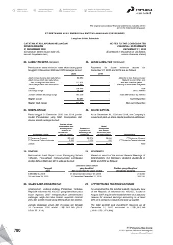 The original consolidated financial statements included hereinare in the Indonesian language.PT PERTAMINA HULU ENERGI DAN ENTITAS ANAK/AND SUBSIDIARIES Lampiran 5/100 ScheduleCATATAN ATAS LAPORAN KEUANGANKONSOLIDASIAN31 DESEMBER 2020(Dinyatakan dalam ribuan dolar AS, kecuali dinyatakan lain)NOTES TO THE CONSOLIDATEDFINANCIAL STATEMENTSDECEMBER 31, 2020(Expressed in thousands of US dollars,unless otherwise stated)23. LIABILITAS SEWA (lanjutan) 23. LEASE LIABILITIES (continued)Pembayaran sewa minimum masa akan datang padatanggal 31 Desember 2020 dan 2019 sebagai berikut:Payments for future minimum leases forDecember 31, 2020 and 2019 are as follows2020 2019Jatuh tempo kurang dari satu tahun 83.593 - Maturity is less than one yearJatuh tempo lebih dari satu tahun Maturity is more than onedan kurang dari lima tahun 117.915 - and less than five yearsJatuh tempo lebih dari lima tahun 4.950 - Maturity is more than five yearsJumlah 206.458 - TotalDikurangi bunga (9.379) - Less: interestJumlah setelah dikurangi bunga 197.079 - Total after deduct by interestBagian lancar 82.267 - Current portionBagian tidak lancar 114.812 - Non-current portion24. MODAL SAHAM 24. SHARE CAPITALPada tanggal 31 Desember 2020 dan 2019, jumlahmodal Perusahaan yang telah ditempatkan dandisetor adalah sebagai berikut:As at December 31, 2020 and 2019, the Company%u2019sissued and paid-up share capital position is as follows:Jumlah sahamditempatkan dan Modaldisetor penuh/ Persentase ditempatkanNumber of kepemilikan/ dan disetor/issued and Percentage of Issued and paidPemegang saham paid-up shares ownership up share capital ShareholdersPT Pertamina (Persero) 197.440 98,72% 52.890 PT Pertamina (Persero)PT Pertamina Pedeve Indonesia 2.560 1,28% 686 PT Pertamina Pedeve IndonesiaJumlah 200.000 100% 53.576 Total25. DIVIDEN 25. DIVIDENDSBerdasarkan hasil Rapat Umum Pemegang SahamTahunan, Perusahaan mengumumkan pembagiandividen tahun 2020 dan 2019 sebagai berikut:Based on results of the Annual General Meetings ofShareholders, the Company declared dividends in2020 and 2019 as follows:Laba neto untuk tahunTanggal/ yang berakhir/ Dividen yang dibagikan/Date Net income for the years ended Dividends declared8 Mei/May 8, 2019 31 Desember/December 31, 2018 213.35529 Juni/June 29, 2020 31 Desember/December 31, 2019 292.74526. SALDO LABA DICADANGKAN 26. APPROPRIATED RETAINED EARNINGSAmandemen Undang-Undang Perseroan TerbatasRepublik Indonesia No. 40/2007 yang diterbitkan padabulan Agustus 2007 mengharuskan pembentukancadangan wajib dari laba ditahan sejumlah minimal20% dari jumlah modal yang ditempatkan dan disetor.An amendment to the Limited Liability Company Lawof the Republic of Indonesia No. 40/2007, issued inAugust 2007 requires the establishment of a statutoryreserve for retained earnings amounting to at least20% of a company%u2019s issued and paid up capital.Jumlah cadangan umum dan investasi per tanggal31 Desember 2020 adalah US$1.582.249 (2019:US$1.571.816).The total general and investment reserves as atDecember 31, 2020 amounted to US$1,582,249(2019: US$1,571,816).Laporan ManajemenManagement ReportProfil PerusahaanCompany ProfileAnalisa & Diskusi ManajemenManagement Discussion & AnalysisIkhtisar 20202020 HighlightsPT Pertamina Hulu Energi2020 Laporan Tahunan TerintegrasiIntegrated Annual Report 780