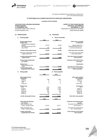 The original consolidated financial statements included hereinare in the Indonesian language.PT PERTAMINA HULU ENERGI DAN ENTITAS ANAK/AND SUBSIDIARIES Lampiran 5/103 ScheduleCATATAN ATAS LAPORAN KEUANGANKONSOLIDASIAN31 DESEMBER 2020(Dinyatakan dalam ribuan dolar AS, kecuali dinyatakan lain)NOTES TO THE CONSOLIDATEDFINANCIAL STATEMENTSDECEMBER 31, 2020(Expressed in thousands of US dollars,unless otherwise stated)32. PERPAJAKAN 32. TAXATIONa. Piutang pajak a. Taxes receivable2020 2019Piutang pajak lainnya Other taxes receivableEntitas Anak Subsidiaries- PPN yang dapat ditagihkankembali 30.275 26.235 Reimbursable VAT -- Withholding taxes dan PPN Withholding taxes and VAT -atas SKPKB 145 151 due to tax assessmentsJumlah piutang pajak lainnya 30.420 26.386 Total other taxes receivableDikurangi: piutang pajak lainnya Less: other taxes receivable- bagian tidak lancar (24.997) (19.830) non-current portion -Jumlah piutang pajak lainnya Total other taxes receivable -- bagian lancar 5.423 6.556 current portionPiutang pajak penghasilan Corporate and dividend taxesdan dividen receivableEntitas Anak Subsidiaries- Pajak penghasilan dandividen 27.951 33.682 Corporate and dividend taxes -Jumlah piutang pajak Total corporate and dividendpenghasilan dan dividen 27.951 33.682 taxes receivableb. Utang pajak b. Taxes payable2020 2019Utang pajak lainnya Other taxes payablePerusahaan The CompanyPasal 21 788 1.393 Article 21Pasal 26 8 11 Article 26PPN 4 5 VATPasal 4(2) 1 6 Article 4(2)Entitas Anak SubsidiariesPPN 7.306 6.958 VATPasal 21 2.097 4.155 Article 21Pasal 23 1.554 1.279 Article 23Pasal 4(2) 231 146 Article 4(2)Pasal 15 122 67 Article 15Pasal 26 9 1 Article 26Jumlah utang pajak lainnya 12.120 14.021 Total other taxes payable2020 2019Utang pajak penghasilan Corporate and dividend taxesdan dividen payablePajak penghasilan dan Corporate and dividend taxesdividen - jangka pendek 40.720 52.371 current portion -Pajak penghasilan dan Corporate and dividend taxesdividen - jangka panjang 14.539 16.772 non - current portion -Jumlah utang pajak Total corporate and dividendpenghasilan dan dividen 55.259 69.143 taxes payableTata Kelola Perusahaan yang BaikGood Corporate GovernanceTanggung Jawab Sosial PerusahaanCorporate Social ResponsibilityLaporan Keuangan KonsolidasianConsolidated Financial ReportPT Pertamina Hulu Energi2020 Laporan Tahunan TerintegrasiIntegrated Annual Report 783