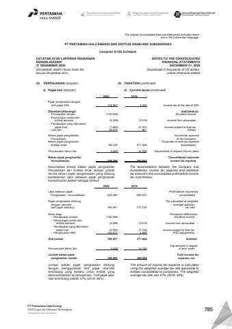 The original consolidated financial statements included hereinare in the Indonesian language.PT PERTAMINA HULU ENERGI DAN ENTITAS ANAK/AND SUBSIDIARIES Lampiran 5/105 ScheduleCATATAN ATAS LAPORAN KEUANGANKONSOLIDASIAN31 DESEMBER 2020(Dinyatakan dalam ribuan dolar AS, kecuali dinyatakan lain)NOTES TO THE CONSOLIDATEDFINANCIAL STATEMENTSDECEMBER 31, 2020(Expressed in thousands of US dollars,unless otherwise stated)32. PERPAJAKAN (lanjutan) 32. TAXATION (continued)d. Pajak kini (lanjutan) d. Current taxes (continued)2020 2019Pajak penghasilan dengantarif pajak 25% 102.997 5.309 Income tax at the rate of 25%Ditambah/(dikurangi): Add/(deduct):- Pendapatan dividen (135.509) - Dividend income -- Keuntungan usaha darientitas asosiasi (4.268) (3.519) Income from associates -- Pendapatan yang dikenakanpajak final (1.893) (2.151) Income subject to final tax -- Lain-lain 38.673 361 Others -Beban pajak penghasilan Income tax expensePerusahaan - - of the CompanyBeban pajak penghasilan Corporate income tax expense- Entitas Anak 192.437 371.948 SubsidiariesPenyesuaian tahun lalu 5.849 (6.108) Adjustments in respect of prior yearsBeban pajak penghasilan Consolidated corporatekonsolidasian 198.286 365.840 income tax expenseRekonsiliasi antara beban pajak penghasilanPerusahaan dan Entitas Anak dengan jumlahteoritis beban pajak pengahasilan yang dihitungberdasarkan laba sebelum pajak penghasilankonsolidasian adalah sebagai berikut:The reconciliations between the Company andSubsidiaries%u2019 income tax expense and teoreticaltax amount in the consolidated profit before incometax is as follows:2020 2019Laba sebelum pajak Profit before income taxPenghasilan - konsolidasian 422.250 955.672 - consolidatedPajak penghasilan dihitung Tax calculated at weighteddengan rata-rata average statutorytarif pajak statutory 190.491 373.726 tax rateBeda tetap: Permanent differences:- Pendapatan dividen (135.559) - Dividend income -- Keuntungan usaha darientitas asosiasi (4.268) (3.519) Income from associates -- Pendapatan yang dikenakanpajak final (2.700) (3.155) Income subject to final tax -- Penyesuaian KBH 144.473 4.896 PSC adjustments -Sub jumlah 192.437 371.948 SubtotalAdjustments in respectPenyesuaian tahun lalu 5.849 (6.108) of prior yearsJumlah beban pajak Total income taxpenghasilan, bersih 198.286 365.840 expense, netJumlah beban pajak penghasilan dihitungdengan menggunakan tarif pajak rata-ratatertimbang yang berlaku untuk entitas yangdikonsolidasikan ke perusahaan. Tarif pajak ratarata tertimbang adalah 47% (2019: 38%)The amount of income tax expense is calculatedusing the weighted average tax rate applicable toentities consolidated to companies. The weightedaverage tax rate was 47% (2019: 38%).Tata Kelola Perusahaan yang BaikGood Corporate GovernanceTanggung Jawab Sosial PerusahaanCorporate Social ResponsibilityLaporan Keuangan KonsolidasianConsolidated Financial ReportPT Pertamina Hulu Energi2020 Laporan Tahunan TerintegrasiIntegrated Annual Report 785