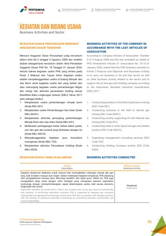UraianDescriptionBidang UsahaBusiness ActivityKegiatan eksplorasi dilakukan untuk mencari dan meningkatkan cadangan minyak dan gas baru, baik di dalam maupun luar negeri. Dalam melakukan kegiatan eksplorasi, PHE didukung oleh pengaplikasian konsep baru, teknologi mutakhir dan tepat guna. Selain itu, PHE juga mengadakan kerja sama dengan mitra strategis yang menguasai advance exploration technology dengan mempertimbangkan aspek keberlanjutan usaha, baik secara ekonomi, lingkungan dan sosial. Exploration activities are performed to search and increase new oil and gas reserves domestically and overseas. In performing exploration activities, PHE is supported by applying new concepts, cutting-edge and appropriate technology. Furthermore, PHE also cooperates with strategic partners with the mastery of advanced exploration technology by considering business, environment, and social sustainability.EksplorasiExplorationTata Kelola Perusahaan yang BaikGood Corporate GovernanceTanggung Jawab Sosial PerusahaanCorporate Social ResponsibilityLaporan Keuangan KonsolidasianConsolidated Financial ReportPT Pertamina Hulu Energi2020 Laporan Tahunan TerintegrasiIntegrated Annual Report 79KEGIATAN DAN BIDANG USAHABusiness Activities and SectorKEGIATAN USAHA PERUSAHAAN MENURUT ANGGARAN DASAR TERAKHIR Menurut Anggaran Dasar Perusahaan yang tercantum dalam akta No.5 tanggal 4 Agustus 2008 dan terakhir diubah sebagaimana tercantum dalam Akta Perubahan Anggaran Dasar PHE No. 18 Tanggal 31 Januari 2020, tertulis bahwa kegiatan usaha PHE yang tertera pada Pasal 3 Maksud dan Tujuan Serta Kegiatan Usaha adalah menyelenggarakan usaha di bidang Minyak dan Gas Bumi serta kegiatan usaha lain yang terkait dan atau menunjang kegiatan usaha pertambangan Migas dan energi dan aktivitas perusahaan holding sesuai Klasifikasi Baku Lingkungan Industri (KBLI) Tahun 2017 yaitu sebagai berikut:1. Menjalankan usaha pertambangan minyak bumi (Kode KBLI 061).2. Menjalankan usaha Pertambangan Gas Alam (kode KBLI 06201).3. Menjalankan aktivitas penunjang pertambangan Minyak Bumi dan Gas Alam (Kode KBLI 091).4. Melakukan perdagangan besar bahan bakar padat, cair dan gas dan produk yang berkaitan dengan itu (Kode KBLI 46610).5. Menyelenggarakan kegiatan jasa konsultasi manajemen (Kode KBLI 702).6. Menjalankan aktivitas Perusahaan Holding (Kode KBLI 6420).KEGIATAN USAHA YANG DIJALANKANBUSINESS ACTIVITIES OF THE COMPANY INACCORDANCE WITH THE LAST ARTICLES OFASSOCIATIONAccording to Company Articles of Association Number 5 of 4 August 2008 and the last amended as stated in PHE Amendment Articles of Association No. 18 of 31 January 2020, stated that the PHE business activities in Article 3 Purpose and Objective and Bussiness Activity is to carry out business in Oil and Gas sector as well as other business activity related to the sector and to support the oil and gas and holding company according to the Indonesian Standard Industrial Classification (ISIC) 2017 :1. Conducting business in the field of petroleum mining (ISIC Code 061).2. Conducting business in the field of natural gas mining (ISIC Code 06201).3. Conducting activity supporting Oil and Natural Gas mining (ISIC Code 091).4. Conducting trade in solid, liquid and gas and related product (ISIC Code 46610).5. Organizing management consulting services (ISIC Code 702)6. Conducting Holding Company activity (ISIC COde 6420)BUSINESS ACTIVITIES CONDUCTED