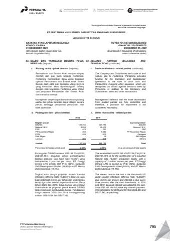 The original consolidated financial statements included hereinare in the Indonesian language.PT PERTAMINA HULU ENERGI DAN ENTITAS ANAK/AND SUBSIDIARIES Lampiran 5/115 ScheduleCATATAN ATAS LAPORAN KEUANGANKONSOLIDASIAN31 DESEMBER 2020(Dinyatakan dalam ribuan dolar AS, kecuali dinyatakan lain)NOTES TO THE CONSOLIDATEDFINANCIAL STATEMENTSDECEMBER 31, 2020(Expressed in thousands of US dollars,unless otherwise stated)33. SALDO DAN TRANSAKSI DENGAN PIHAKBERELASI (lanjutan)33. RELATED PARTIES BALANCES ANDTRANSACTIONS (continued)c. Piutang usaha - pihak berelasi (lanjutan) c. Trade receivables - related parties (continued)Perusahaan dan Entitas Anak menjual minyakmentah dan gas bumi kepada Pertamina.Pertamina memberikan dana untuk kegiatanoperasi Perusahaan dan Entitas Anak dalambentuk cash calls dan transaksi utang lainnyayang kemudian akan diperhitungkan (offset)dengan nilai kewajiban Pertamina yang timbuldari penjualan Perusahaan dan Entitas Anakdan transaksi lainnya.The Company and Subsidiaries sell crude oil andnatural gas to Pertamina. Pertamina providesfunding for the Company and Subsidiaries%u2019operations in the form of cash calls andtransactions involving other payables, which arerecognised as offsets against amounts owed byPertamina in relation to the Company andSubsidiaries%u2019 sales and other transactions.Manajemen berpendapat bahwa seluruh piutangusaha dari pihak berelasi dapat ditagih secarapenuh, sehingga penyisihan penurunan nilaitidak diperlukan.Management believes that the trade receivablesfrom related parties are fully collectible andtherefore, a provision for impairment is notconsidered necessary.d. Piutang lain-lain - pihak berelasi d. Other receivables - related parties2020 2019Bagian lancar: Current portion:DSLNG 126.734 121.784 DSLNGNatuna 2 B.V. 8.838 16.412 Natuna 2 B.V.PEP 479 291 PEPPT Nusantara Regas 455 1.683 PT Nusantara RegasPGN 439 615 PertagasSKK Migas - 19 SKK MigasLainnya 295 318 OthersJumlah 137.240 141.122 TotalPersentase terhadap jumlah aset 2,58% 2,75% As a percentage of total assetsPiutang dari DSLNG sebesar US$126.734 (2020:US$121.784) ditujukan untuk pembangunanfasilitas produksi Gas Alam Cair (%u201cLNG%u201d) yangberkapasitas 2 juta ton per tahun. PT DonggiSenoro LNG dimiliki oleh PHE (29%), SulawesiLNG Development Limited (59,9%) dan PT MedcoLNG Indonesia (11,1%).The receivable from DSLNG of US$126,734 (2019:US$121,784) is for the construction of a LiquifiedNatural Gas (%u201cLNG%u201d) production facility with acapacity of 2 million tonnes per year. PT DonggiSenoro LNG is owned by PHE (29%), SulawesiLNG Development Limited (59.9%) and PT MedcoLNG Indonesia (11.1%).Tingkat suku bunga pinjaman adalah LondonInterbank Offering Rate (%u201cLIBOR%u201d) dolar AS satubulan ditambah 3,75% per tahun dan jatuh temposetiap tiga bulan setelah pinjaman dicairkan. Padatahun 2020 dan 2019, biaya bunga yang timbulditambahkan ke pinjaman pokok karena DSLNGtidak melakukan pembayaran bunga. Pendapatanbunga selama 2020 dan 2019 masing-masingadalah US$5.824 dan US$7.393.The interest rate on the loan is the one month USdollar London Interbank Offering Rate (%u201cLIBOR%u201d)plus 3.75% per annum and interest is due everythree months after the loan drawdowns. In 2020and 2019, accrued interest was added to the loan,since DSLNG did not make any interest payment.Interest income for 2020 and 2019 is US$5,824 andUS$7,393, respectively.Tata Kelola Perusahaan yang BaikGood Corporate GovernanceTanggung Jawab Sosial PerusahaanCorporate Social ResponsibilityLaporan Keuangan KonsolidasianConsolidated Financial ReportPT Pertamina Hulu Energi2020 Laporan Tahunan TerintegrasiIntegrated Annual Report 795