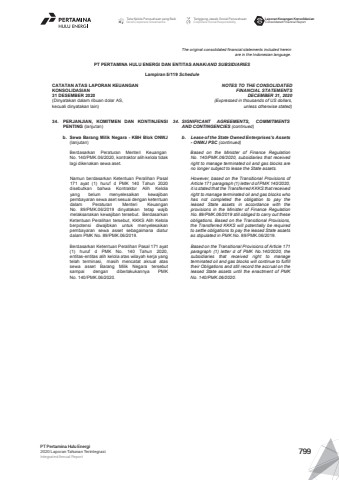 The original consolidated financial statements included hereinare in the Indonesian language.PT PERTAMINA HULU ENERGI DAN ENTITAS ANAK/AND SUBSIDIARIES Lampiran 5/119 ScheduleCATATAN ATAS LAPORAN KEUANGANKONSOLIDASIAN31 DESEMBER 2020(Dinyatakan dalam ribuan dolar AS, kecuali dinyatakan lain)NOTES TO THE CONSOLIDATEDFINANCIAL STATEMENTSDECEMBER 31, 2020(Expressed in thousands of US dollars,unless otherwise stated)34. PERJANJIAN, KOMITMEN DAN KONTINJENSIPENTING (lanjutan)34. SIGNIFICANT AGREEMENTS, COMMITMENTSAND CONTINGENCIES (continued)b. Sewa Barang Milik Negara - KBH Blok ONWJ(lanjutan)b. Lease of the State Owned Enterprises%u2019s Assets- ONWJ PSC (continued)Berdasarkan Peraturan Menteri KeuanganNo. 140/PMK.06/2020, kontraktor alih kelola tidaklagi dikenakan sewa aset.Based on the Minister of Finance RegulationNo. 140/PMK.06/2020, subsidiaries that receivedright to manage terminated oil and gas blocks areno longer subject to lease the State assets.Namun berdasarkan Ketentuan Peralihan Pasal171 ayat (1) huruf d PMK 140 Tahun 2020disebutkan bahwa Kontraktor Alih Kelolayang belum menyelesaikan kewajibanpembayaran sewa aset sesuai dengan ketentuandalam Peraturan Menteri KeuanganNo. 89/PMK.06/2019 dinyatakan tetap wajibmelaksanakan kewajiban tersebut. BerdasarkanKetentuan Peralihan tersebut, KKKS Alih Kelolaberpotensi diwajibkan untuk menyelesaikanpembayaran sewa asset sebagaimana diaturdalam PMK No. 89/PMK.06/2019.However, based on the Transitional Provisions ofArticle 171 paragraph (1) letter d of PMK 140/2020,it is stated that the Transferred KKKS that receivedright to manage terminated oil and gas blocks whohas not completed the obligation to pay theleased State assets in accordance with theprovisions in the Minister of Finance RegulationNo. 89/PMK.06/2019 still obliged to carry out theseobligations. Based on the Transitional Provisions,the Transferred KKKS will potentially be requiredto settle obligations to pay the leased State assetsas stipulated in PMK No. 89/PMK.06/2019.Berdasarkan Ketentuan Peralihan Pasal 171 ayat(1) huruf d PMK No. 140 Tahun 2020,entitas-entitas alih kelola atas wilayah kerja yangtelah terminasi, masih mencatat akrual atassewa asset Barang Milik Negara tersebutsampai dengan diberlakukannya PMKNo. 140/PMK.06/2020.Based on the Transitional Provisions of Article 171paragraph (1) letter d of PMK No.140/2020, thesubsidiaries that received right to manageterminated oil and gas blocks will continue to fulfilltheir Obligations and still record the accrual on theleased State assets until the enactment of PMKNo. 140/PMK.06/2020.Tata Kelola Perusahaan yang BaikGood Corporate GovernanceTanggung Jawab Sosial PerusahaanCorporate Social ResponsibilityLaporan Keuangan KonsolidasianConsolidated Financial ReportPT Pertamina Hulu Energi2020 Laporan Tahunan TerintegrasiIntegrated Annual Report 799