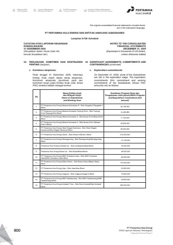 The original consolidated financial statements included hereinare in the Indonesian language.PT PERTAMINA HULU ENERGI DAN ENTITAS ANAK/AND SUBSIDIARIES Lampiran 5/120 ScheduleCATATAN ATAS LAPORAN KEUANGANKONSOLIDASIAN31 DESEMBER 2020(Dinyatakan dalam ribuan dolar AS, kecuali dinyatakan lain)NOTES TO THE CONSOLIDATEDFINANCIAL STATEMENTSDECEMBER 31, 2020(Expressed in thousands of US dollars,unless otherwise stated)34. PERJANJIAN, KOMITMEN DAN KONTINJENSIPENTING (lanjutan)34. SIGNIFICANT AGREEMENTS, COMMITMENTS ANDCONTINGENCIES (continued)c. Komitmen eksplorasi c. Exploration commitmentsPada tanggal 31 Desember 2020, beberapaEntitas Anak masih dalam tahap eksplorasi.Komitmen eksplorasi (komitmen pasti dankomitmen kerja) pada Entitas Anak (nilai GrossPSC) tersebut adalah sebagai berikut:On December 31, 2020, some of the Subsidiariesare still in the exploration stage. The explorationcommitments (firm commitment and workingcommitment) of the Subsidiaries (Gross PSCamounts) are as follows:NoNama Entitas Anakdan Wilayah Kerja/Name of Subsidiariesand Working AreaKomitmen Program Kerja danPengeluaran (nilai penuh)/Work Programand Expenditure Commitment (fullamount)1. PT Pertamina Hulu Energi Metana Kalimantan B - Blok Sangatta II/Sangatta IIBlock 20.128.2332. PT Pertamina Hulu Energi Metana Sumatera Tanjung Enim - Blok TanjungEnim/Tanjung Enim Block 14.483.8633. PT Pertamina Hulu Energi Metana Sumatera 2 - Blok Muara Enim/Muara EnimBlock 11.750.0004. PT Pertamina Hulu Energi Metana Sumatera 5 - Blok Muara Enim II/MuaraEnim II Block 23.850.0005. PT Pertamina Hulu Energi West Glagah Kambuna - Blok West GlagahKambuna/West Glagah Kambuna Block 55.000.0006. PT Pertamina Hulu Energi Semai - Blok Semai II/Semai II Block 214.000.0007. PT Pertamina Hulu Energi Randugunting - Blok Randugunting/RanduguntingBlock 14.100.0008. Pertamina Hulu Energi Ambalat Ltd. - Blok Ambalat/Ambalat Block 16.500.0009. Pertamina Hulu Energi Bukat Ltd. - Blok Bukat/Bukat Block 48.000.00010. PT Pertamina Hulu Energi MNK Sumatera Utara - Blok MNK SumateraUtara/MNK Sumatera Utara Block 84.800.00011. PT Pertamina Hulu Energi Babar Selaru - Blok Babar Selaru/Babar SelaruBlock 173.000.00012. PT Pertamina Hulu Energi Abar - Blok Abar/Abar Block 23.800.00013. PT Pertamina Hulu Energi Anggursi - Blok Anggursi/Anggursi Block 15.800.00014. PT Pertamina Hulu Energi MNK Sakakemang - Blok MNK Sakakemang/MNKSakakemang Block 35.850.00015. PT Pertamina Hulu Energi Ambalat Timur - Blok East Ambalat/East AmbalatBlock 225.000.000Laporan ManajemenManagement ReportProfil PerusahaanCompany ProfileAnalisa & Diskusi ManajemenManagement Discussion & AnalysisIkhtisar 20202020 HighlightsPT Pertamina Hulu Energi2020 Laporan Tahunan TerintegrasiIntegrated Annual Report 800