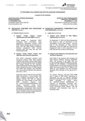 The original consolidated financial statements included hereinare in the Indonesian language.PT PERTAMINA HULU ENERGI DAN ENTITAS ANAK/AND SUBSIDIARIES Lampiran 5/124 ScheduleCATATAN ATAS LAPORAN KEUANGANKONSOLIDASIAN31 DESEMBER 2020(Dinyatakan dalam ribuan dolar AS, kecuali dinyatakan lain)NOTES TO THE CONSOLIDATEDFINANCIAL STATEMENTSDECEMBER 31, 2020(Expressed in thousands of US dollars,unless otherwise stated)34. PERJANJIAN, KOMITMEN DAN KONTINJENSIPENTING (lanjutan)34. SIGNIFICANT AGREEMENTS, COMMITMENTS ANDCONTINGENCIES (continued)e. Perkara hukum (lanjutan) e. Legal case (continued)ii. Dugaan Tindak Pidana TerkaitOperatorship oleh PHE WMO (lanjutan)ii. Alleged crime Related to PHE WMO%u2019sOperatorship (continued)Pada tanggal 11 September 2020,Kepolisian telah menerbitkan Suratpenghentian penyidikan Laporan PolisiMMB. Sampai dengan laporan keuangan initerbit, PHE dan MMB sedang melakukanfinalisasi engagement letter evaluasibersama atas over cash call dan overrevenue para pihak.On September 11, 2020, the Police Departmenthas issued a letter of termination of theinvestigation of such Police Report. . Until thedate of the finalization of these financialstatements, PHE and MMB are finalizing theengagement letter of joint evaluation of overcash calls and over revenue of the parties.iii. Dugaan Tindak Pidana Terkait JoinOperation dan Exclusive Operationiii. Alleged crime Related to Joint Operation andExclusive OperationPHE WMO merupakan operator yangmengelola Wilayah Kerja West MaduraOffshore (KKS WMO). Mitra di KKKS WMOadalah PT Mandiri Madura Barat (PT MMB)dan Kodeco Energy Co Ltd. (Kodeco).Dalam pelaksanaan operasi migas oleh PHEWMO, terdapat klaim dari PT MMB kepadaPHE WMO atas kegiatan Joint Operation(JO ) dan Exclusive Operation (EO) periodetahun 2011 -2019.PHE WMO is the operator that manages theWest Madura Offshore Working Area(WMOPSC). The partners in the WMO PSC arePT Mandiri Madura Barat (PT MMB) and KodecoEnergy Co Ltd. (Kodeco). In conducting theimplementation of oil and gas operations by PHEWMO, there was a claim from PT MMB to PHEWMO for Joint Operation (JO) and ExclusiveOperation (EO) activities for the period 2011-2019.Pada bulan Januari, Februari dan April 2020,MMB mengirimkan 5 surat kepada PHEWMO meminta penyesuaian atas EOsebesar US$124 ribu dan JO sebesarUS$195 ribu. Pada tanggal 15 April 2020,MMB membuat laporan polisiNo. LB/B/0191/IV/2020/BARESKRIM atasdugaan melakukan tindak pidanapemalsuan, penipuan/perbuatan curang,penggelapan, penggelapan dalam jabatandan tindak pidana pencucian uang (LaporanPolisi). Klarifikasi terakhir dengan Bareskrimadalah di bulan November 2020.On January, February, and April 2020, MMBsent 5 letters to PHE WMO, requesting anadjustment for EO of US$124 thousandand JO of US$195 thousand. On April 15, 2020,MMB submitted a police reportNo. LB/B/0191/IV/2020/ BARESKRIM onsuspicion of falsification, fraudulent acts,embezzlement, embezzlement in office, andmoney laundering (Police Report). The lastclarification with Bareskrim was held inNovember 2020.The original consolidated financial statements included hereinare in the Indonesian language.PT PERTAMINA HULU ENERGI DAN ENTITAS ANAK/AND SUBSIDIARIES Lampiran 5/125 ScheduleCATATAN ATAS LAPORAN KEUANGANKONSOLIDASIAN31 DESEMBER 2020(Dinyatakan dalam ribuan dolar AS, kecuali dinyatakan lain)NOTES TO THE CONSOLIDATEDFINANCIAL STATEMENTSDECEMBER 31, 2020(Expressed in thousands of US dollars,unless otherwise stated)34. PERJANJIAN, KOMITMEN DAN KONTINJENSIPENTING (lanjutan)34. SIGNIFICANT AGREEMENTS, COMMITMENTS ANDCONTINGENCIES (continued)e. Perkara hukum (lanjutan) e. Legal case (continued)iii. Dugaan Tindak Pidana Terkait JoinOperation dan Exclusive Operation(lanjutan)iii. Alleged crime Related to Joint Operationand Exclusive Operation (continued)Laporan polisi tersebut saat ini dalamproses penyidikan. Sebagai bentuk kehatihatian, PHE WMO telah meminta pendapathukum dari Kejaksaan Agung RepublikIndonesia dengan pokok-pokok pendapatantara lain:- Klaim biaya penyesuaian JO tidak tepatdiajukan kepada PHE WMO.- Karena MMB tidak membiayai kegiatanEO, maka MMB tidak berhakmengajukan klaim penyesuaian biayaEO.- Hak untuk melakukan penyesuaiansudah lewat waktu sebagaimana diaturdalam JOA.The police report is currently underinvestigation. As a form of prudence, PHEWMO has requested a legal opinion from theAttorney General's Office of the Republic ofIndonesia with the main points of opinion,among others:- Claim for JO%u2019s cost adjustment is notappropriate to be submitted to PHE WMO.- Because MMB does not finance the EOactivities, MMB is not entitled to submitclaims for EO%u2019s cost adjustment.- The right to make adjustments has expiredas stipulated in the JOA.Sampai dengan laporan keuangan ini terbit,PHE dan MMB sedang melakukan finalisasitandatangan atas letter of engagementevaluasi bersama atas biaya danpendapatan JO dan EO periode 2011-2019.As of the publication of this financial report,PHE and MMB are currently finalizing thesignature of the letter of engagement, jointevaluation of the costs and revenues of JOand EO for the 2011-2019 period.f. Perjanjian Pengalihan 10% ParticipatingInterest di KBH Blok ONWJf. Agreement to transfer a 10% ParticipatingInterest in ONWJ PSCPada tanggal 19 Desember 2017 PT PHE ONWJdan MUJ ONWJ menandatangi perjanjianpengalihan 10% Participating Interest (%u201cPI%u201d) diKBH Blok ONWJ dari PT PHE ONWJ ke MUJONWJ. Perjanjian tersebut berlaku efektif padatanggal diterimanya persetujuan dari MenteriEnergi dan Sumber Daya Mineral (%u201cESDM%u201d) ataupada tanggal yang ditetapkan oleh MenteriEnergi dan Sumber Daya Mineral dalam suratpersetujuannya.On December 19, 2017, PT PHE ONWJ andMUJ ONWJ entered into an agreement to transfera 10% of PT PHE ONWJ%u2019s participating interest(%u201cPI%u201d) in the ONWJ PSC to MUJ ONWJ. Suchtransfer will become effective upon approval by theMinister of Energy and Mineral Resources(%u201cESDM%u201d) or on a date stated by the Minister ofE