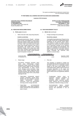 The original consolidated financial statements included hereinare in the Indonesian language.PT PERTAMINA HULU ENERGI DAN ENTITAS ANAK/AND SUBSIDIARIES Lampiran 5/130 ScheduleCATATAN ATAS LAPORAN KEUANGANKONSOLIDASIAN31 DESEMBER 2020(Dinyatakan dalam ribuan dolar AS, kecuali dinyatakan lain)NOTES TO THE CONSOLIDATEDFINANCIAL STATEMENTSDECEMBER 31, 2020(Expressed in thousands of US dollars,unless otherwise stated)36. KEBIJAKAN MANAJEMEN RISIKO 36. RISK MANAGEMENT POLICYb. Risiko pasar (lanjutan) b. Market risk (continued)i. Risiko nilai tukar mata uang asing (lanjutan) i. Foreign exchange risk (continued)Analisis sensitivitas Sensitivity analysisPenguatan/(pelemahan) Rupiah terhadapdolar AS akan meningkatkan/ (menurunkan)laba/(rugi) sebesar jumlah yang ditunjukkandi bawah. Analisis ini didasarkan pada variannilai tukar mata uang asing yang mungkinterjadi pada tanggal pelaporan yang ada diPerusahaan dan Entitas Anak. Analisisdilakukan dengan dasar yang sama padatahun 2020, meskipun varian nilai tukar matauang asing yang mungkin terjadi berbeda,seperti ditunjukkan di bawah ini.A strengthening/(weakening) of Rupiah to theUS dollar would have increased/(decreased)profit/(loss) by the amounts shown below.This analysis is based on foreign currencyexchange rate variances that are consideredto be reasonably possible at the reportingdate of the Company and Subsidiaries. Theanalysis is performed on the same basis for2020, except that the reasonably possibleforeign exchange rate variances weredifferent, as shown below.Penguatan/Strengthening Pelemahan/WeakeningLaba atau (rugi)/Profit or (loss) Laba atau (rugi)/Profit or (loss)31 Desember 2020 December, 31 2020IDR (pergerakan 5%) 2.315 (2.095) IDR (movement 5%)ii. Risiko harga ii. Price riskPerusahaan terekspos terhadap risikopasar yang berhubungan denganpergerakan harga minyak mentah karenaminyak mentah adalah produk komoditasyang diperjualbelikan di pasar minyakdunia. Sebagai produk komoditas, hargaminyak mentah sangat tergantung padadinamika pasokan dan permintaan minyakmentah di pasar ekspor dunia, yang sangatdipengaruhi oleh:The Company is exposed to market riskassociated with the price movements of crudeoil since crude oil is a commodity producttraded on the world crude markets. As acommodity product, global crude oil prices areprincipally dependent on the supply anddemand dynamics of crude oil in the worldexport market which are significantly affectedby:- Faktor-faktor fundamental (sepertiproduksi, persediaan, kondisi kilang,fasilitas pipa dan kebijakan produksi,tingkat pertumbuhan ekonomi,kebutuhan, musim dan ketersediaanteknologi sumber tenaga alternatif).- Fundamental factors (such asproduction, inventory, conditions ofrefineries, pipeline facilities andproduction policy, economic growth,needs, seasons and the technologicalavailability of alterative energy sources).- Faktor-faktor non-fundamental(kekhawatiran pasar akibat gangguanpolitik, keamanan dan aksi spekulasi dipasar minyak).- Non-fundamental factors (marketconcerns due to political uncertainty,security and speculation in the oilmarket).Laporan ManajemenManagement ReportProfil PerusahaanCompany ProfileAnalisa & Diskusi ManajemenManagement Discussion & AnalysisIkhtisar 20202020 HighlightsPT Pertamina Hulu Energi2020 Laporan Tahunan TerintegrasiIntegrated Annual Report 810