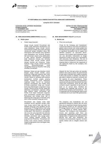 The original consolidated financial statements included hereinare in the Indonesian language.PT PERTAMINA HULU ENERGI DAN ENTITAS ANAK/AND SUBSIDIARIES Lampiran 5/131 ScheduleCATATAN ATAS LAPORAN KEUANGANKONSOLIDASIAN31 DESEMBER 2020(Dinyatakan dalam ribuan dolar AS, kecuali dinyatakan lain)NOTES TO THE CONSOLIDATEDFINANCIAL STATEMENTSDECEMBER 31, 2020(Expressed in thousands of US dollars,unless otherwise stated)36. KEBIJAKAN MANAJEMEN RISIKO (lanjutan) 36. RISK MANAGEMENT POLICY (continued)b. Risiko pasar b. Market riskii. Risiko harga (lanjutan) ii. Price risk (continued)Harga minyak mentah Perusahaan danEntitas Anak ditentukan berdasarkan ICPyang didasarkan harga minyak mentahdunia dengan kualitas yang sama sehinggacenderung sangat mengikuti siklus danterpengaruh oleh fluktuasi yang signifikanyang disebabkan oleh dinamika pasokandan permintaan seperti yang didiskusikandi atas. Namun demikian, Perusahaantidak melakukan lindung nilai terhadapfluktuasi harga minyak mentah sesuaidengan instruksi dari Pertamina. Risikofluktuasi harga minyak mentah dimonitorsecara berkesinambungan untukmengetahui besarnya eksposur risiko yangdihadapi Perusahaan.Prices for the Company and Subsidiaries%u2019crude oil are based on ICP which are based onglobal crude oil prices with similar grades andtherefore tend to be highly cyclical and subjectto significant fluctuations due to supply anddemand dynamics as discussed above.However, the Company and Subsidiaries doesnot use derivative instruments to hedgeexposure to crude oil price risk in accordancewith instruction from Pertamina. The risk ofcrude oil price fluctuations is monitored on anongoing basis to determine the magnitude ofrisk exposures faced by the Company andSubsidiaries.Meskipun harga jual gas biasanya terkaitdengan harga minyak mentah, rumuspenentuan harga gas biasanya lebih tidakberfluktuasi dibandingkan harga minyakmentah. Selain itu, penjualan gas biasanyaberdasarkan kontrak jangka panjangdengan kemampuan untuk melakukannegosiasi harga. Ciri-ciri ini membuateksposur Perusahaan dan Entitas Anakterhadap pergerakan harga gas menjadiberkurang dibandingkan pergerakan hargaminyak. Karena semua kontrak harga gasditentukan berdasarkan negosiasi palingtidak setahun sekali, Perusahaan danEntitas Anak dapat melakukan negosiasiyang memberikan manfaat lebih kepadaPerusahaan dan Entitas Anak. Hal inididukung oleh harga gas di Indonesia yanglebih rendah daripada harga gas dunia.Despite the fact that gas prices are typicallylinked to the crude oil price, the price formulafor gas sales is typically less volatile comparedto the crude oil price. In addition, the nature ofgas sales is based on long-term contracts withthe capacity for price negotiations. Thesefeatures make the Company and Subsidiaries%u2019exposures with gas price movements less thancrude price movements. Since all gas salescontracts require negotiation of gas prices atleast on an annual basis, therefore theCompany can negotiate gas prices for thebenefit of the Company and Subsidiaries. Thisis supported with the average gas sales pricesin Indonesia are much lower than global prices.Perusahaan dan Entitas Anak tidakterekspos secara signifikan dengan risikosuku bunga karena tidak ada aset danliabilitas berbunga yang signifikan kecualipiutang dari PT Donggi Senoro LNG yangtingkat bunganya dipengaruhi oleh tingkatbunga pasar. Oleh karena itu, pendapatandan arus kas yang diperoleh dari aktivitasoperasi secara substansial independenterhadap perubahan suku bunga pasar.Untuk piutang kepada DSLNG danpinjaman dari Pertamina, Perusahaan danEntitas Anak secara berkala memonitortingkat bunga pasar untuk memitigasi risikosuku bunga.The Company and Subsidiaries are notsignificantly exposed to interest rate risk sincethere are no significant interest bearing assetsand liabilities except for the receivable fromPT Donggi Senoro LNG for which the interestrate is impacted by market interest rates.Therefore, the Company%u2019s and Subsidiaries%u2019income and operating cash flows aresubstantially independent of changes in marketinterest rates. In respect to the receivable fromDSLNG and loan from Pertamina, theCompany and Subsidiaries regularly monitorsmarket interest rate to mitigate interest raterisk.Tata Kelola Perusahaan yang BaikGood Corporate GovernanceTanggung Jawab Sosial PerusahaanCorporate Social ResponsibilityLaporan Keuangan KonsolidasianConsolidated Financial ReportPT Pertamina Hulu Energi2020 Laporan Tahunan TerintegrasiIntegrated Annual Report 811