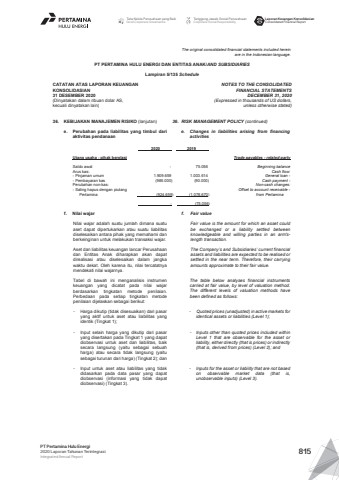 The original consolidated financial statements included hereinare in the Indonesian language.PT PERTAMINA HULU ENERGI DAN ENTITAS ANAK/AND SUBSIDIARIES Lampiran 5/135 ScheduleCATATAN ATAS LAPORAN KEUANGANKONSOLIDASIAN31 DESEMBER 2020(Dinyatakan dalam ribuan dolar AS, kecuali dinyatakan lain)NOTES TO THE CONSOLIDATEDFINANCIAL STATEMENTSDECEMBER 31, 2020(Expressed in thousands of US dollars,unless otherwise stated)36. KEBIJAKAN MANAJEMEN RISIKO (lanjutan) 36. RISK MANAGEMENT POLICY (continued)e. Perubahan pada liabilitas yang timbul dariaktivitas pendanaane. Changes in liabilities arising from financingactivities2020 2019Utang usaha - pihak berelasi Trade payables - related partySaldo awal - 75.056 Beginning balanceArus kas: Cash flo- Pinjaman umum 1.909.659 1.003.614 General loan -- Pembayaran kas (985.000) (90.000) Cash payment -Perubahan non-kas: Non-cash changes:- Saling hapus dengan piutang Offset to account receivable -Pertamina (924.659) (1.078.670) from Pertamina- (75.056)f. Nilai wajar f. Fair valueNilai wajar adalah suatu jumlah dimana suatuaset dapat dipertukarkan atau suatu liabilitasdiselesaikan antara pihak yang memahami danberkeinginan untuk melakukan transaksi wajar.Fair value is the amount for which an asset couldbe exchanged or a liability settled betweenknowledgeable and willing parties in an arm'slength transaction.Aset dan liabilitas keuangan lancar Perusahaandan Entitas Anak diharapkan akan dapatdirealisasi atau diselesaikan dalam jangkawaktu dekat. Oleh karena itu, nilai tercatatnyamendekati nilai wajarnya.The Company%u2019s and Subsidiaries%u2019 current financialassets and liabilities are expected to be realised orsettled in the near term. Therefore, their carryingamounts approximate to their fair value.Tabel di bawah ini menganalisis instrumenkeuangan yang dicatat pada nilai wajarberdasarkan tingkatan metode penilaian.Perbedaan pada setiap tingkatan metodepenilaian dijelaskan sebagai berikut:The table below analyses financial instrumentscarried at fair value, by level of valuation method.The different levels of valuation methods havebeen defined as follows:- Harga dikutip (tidak disesuaikan) dari pasaryang aktif untuk aset atau liabilitas yangidentik (Tingkat 1);- Quoted prices (unadjusted) in active markets foridentical assets or liabilities (Level 1);- Input selain harga yang dikutip dari pasaryang disertakan pada Tingkat 1 yang dapatdiobservasi untuk aset dan liabilitas, baiksecara langsung (yaitu sebagai sebuahharga) atau secara tidak langsung (yaitusebagai turunan dari harga) (Tingkat 2); dan- Inputs other than quoted prices included withinLevel 1 that are observable for the asset orliability, either directly (that is prices) or indirectly(that is, derived from prices) (Level 2); and- Input untuk aset atau liabilitas yang tidakdidasarkan pada data pasar yang dapatdiobservasi (informasi yang tidak dapatdiobservasi) (Tingkat 3).- Inputs for the asset or liability that are not basedon observable market data (that is,unobservable inputs) (Level 3).Tata Kelola Perusahaan yang BaikGood Corporate GovernanceTanggung Jawab Sosial PerusahaanCorporate Social ResponsibilityLaporan Keuangan KonsolidasianConsolidated Financial ReportPT Pertamina Hulu Energi2020 Laporan Tahunan TerintegrasiIntegrated Annual Report 815