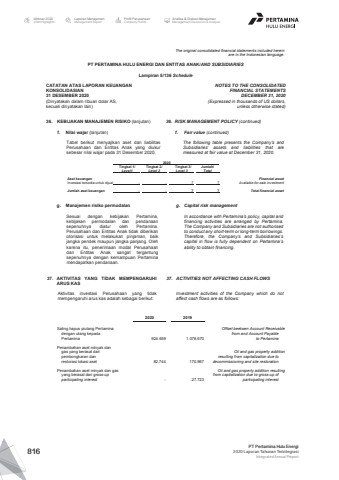 The original consolidated financial statements included hereinare in the Indonesian language.PT PERTAMINA HULU ENERGI DAN ENTITAS ANAK/AND SUBSIDIARIES Lampiran 5/136 ScheduleCATATAN ATAS LAPORAN KEUANGANKONSOLIDASIAN31 DESEMBER 2020(Dinyatakan dalam ribuan dolar AS, kecuali dinyatakan lain)NOTES TO THE CONSOLIDATEDFINANCIAL STATEMENTSDECEMBER 31, 2020(Expressed in thousands of US dollars,unless otherwise stated)36. KEBIJAKAN MANAJEMEN RISIKO (lanjutan) 36. RISK MANAGEMENT POLICY (continued)f. Nilai wajar (lanjutan) f. Fair value (continued)Tabel berikut menyajikan aset dan liabilitasPerusahaan dan Entitas Anak yang diukursebesar nilai wajar pada 31 Desember 2020.The following table presents the Company%u2019s andSubsidiaries%u2019 assets and liabilities that aremeasured at fair value at December 31, 2020.2020Tingkat 1/ Tingkat 2/ Tingkat 3/ Jumlah/Level1 Level 2 Level 3 TotalAset keuangan Financial assetInvestasi tersedia untuk dijual - - 7 7 Available-for-sale investmentJumlah aset keuangan - - 7 7 Total financial assetg. Manajemen risiko permodalan g. Capital risk managementSesuai dengan kebijakan Pertamina,kebijakan permodalan dan pendanaansepenuhnya diatur oleh Pertamina.Perusahaan dan Entitas Anak tidak diberikanotorisasi untuk melakukan pinjaman, baikjangka pendek maupun jangka panjang. Olehkarena itu, penerimaan modal Perusahaandan Entitas Anak sangat tergantungsepenuhnya dengan kemampuan Pertaminamendapatkan pendanaan.In accordance with Pertamina%u2019s policy, capital andfinancing activities are arranged by Pertamina.The Company and Subsidiaries are not authorisedto conduct any short-term or long-term borrowings.Therefore, the Company%u2019s and Subsidiaries%u2019scapital in flow is fully dependent on Pertamina%u2019sability to obtain financing.37. AKTIVITAS YANG TIDAK MEMPENGARUHIARUS KAS37. ACTIVITIES NOT AFFECTING CASH FLOWSAktivitas investasi Perusahaan yang tidakmempengaruhi arus kas adalah sebagai berikut:Investment activities of the Company which do notaffect cash flows are as follows:2020 2019Saling hapus piutang Pertamina Offset beetwen Account Receivabledengan utang kepada from and Account PayablePertamina 924.659 1.078.670 to PertaminaPenambahan aset minyak dangas yang berasal dari Oil and gas property additionpembongkaran dan resulting from capitalization due torestorasi lokasi aset 82.744 170.967 decommissioning and site restorationPenambahan aset minyak dan gas Oil and gas property addition resultingyang berasal dari gross-up from capitalization due to gross-up ofparticipating interest - 27.723 participating interestLaporan ManajemenManagement ReportProfil PerusahaanCompany ProfileAnalisa & Diskusi ManajemenManagement Discussion & AnalysisIkhtisar 20202020 HighlightsPT Pertamina Hulu Energi2020 Laporan Tahunan TerintegrasiIntegrated Annual Report 816