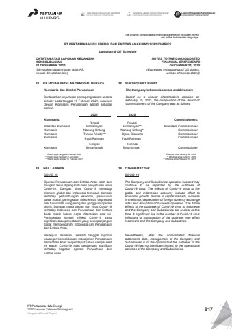 The original consolidated financial statements included hereinare in the Indonesian language.PT PERTAMINA HULU ENERGI DAN ENTITAS ANAK/AND SUBSIDIARIES Lampiran 5/137 ScheduleCATATAN ATAS LAPORAN KEUANGANKONSOLIDASIAN31 DESEMBER 2020(Dinyatakan dalam ribuan dolar AS, kecuali dinyatakan lain)NOTES TO THE CONSOLIDATEDFINANCIAL STATEMENTSDECEMBER 31, 2020(Expressed in thousands of US dollars,unless otherwise stated)38. KEJADIAN SETELAH TANGGAL NERACA 38. SUBSEQUENT EVENTKomisaris dan Direksi Perusahaan The Company%u2019s Commissioners and DirectorsBerdasarkan keputusan pemegang saham secarasirkuler pada tanggal 15 Februari 2021, susunanDewan Komisaris Perusahaan adalah sebagaiberikut:Based on a circular shareholder's decision onFebruary 15, 2021, the composition of the Board ofCommissioners of the Company was as follows:2021 2020Komisaris: Commissioners:Presiden KomisarisRinaldiFirmansyahRinaldiFirmansyah** President CommissionerKomisaris Nanang Untung Nanang Untung* CommissionerKomisaris Tutuka Ariadji*** Djoko Siswanto CommissionerKomisaris Fadli Rahman Fadli Rahman* CommissionerKomisarisTumpakSimanjuntakTumpakSimanjuntak** Commissioner* Efektif sejak tanggal 28 Januari 2020 * Effective since January 28, 2020** Efektif sejak tanggal 13 Juni 2020 ** Effective since June 13, 2020***Efektif sejak tanggal 15 Februari 2021 ** Effective since February 15, 202139. HAL LAINNYA 39. OTHER MATTERCOVID-19Operasi Perusahaan dan Entitas Anak telah danmungkin terus dipengaruhi oleh penyebaran virusCovid-19. Dampak virus Covid-19 terhadapekonomi global dan Indonesia termasuk dampakterhadap pertumbungan ekonomi, penurunanpasar modal, peningkatan risiko kredit, depresiasinilai tukar mata uang asing dan gangguan operasibisnis. Dampak masa depan dari virus Covid-19terhadap Indonesia dan Perusahaan dan EntitasAnak masih belum dapat ditentukan saat ini.Peningkatan jumlah infeksi Covid-19 yangsignifikan atau penyebaran yang berkepanjangandapat mempengaruhi Indonesia dan Perusahaandan Entitas Anak.COVID-19The Company and Subsidiaries%u2019 operation has and maycontinue to be impacted by the outbreak ofCovid-19 virus. The effects of Covid-19 virus to theglobal and Indonesian economy include effect toeconomic growth, decline in capital markets, increasein credit risk, depreciation of foreign currency exchangerates and disruption of business operation. The futureeffects of the outbreak of Covid-19 virus to Indonesiaand the Company and Subsidiaries are unclear at thistime. A significant rise in the number of Covid-19 virusinfections or prolongation of the outbreak may affectIndones/ia and the Company and Subsidiries.Meskipun demikian, setelah tanggal laporankeuangan konsolidasian, manajemen Perusahaandan Entitas Anak berpendapat bahwa sampai saatini wabah Covid-19 tidak berdampak signifikanterhadap kegiatan operasi Perusahaan danEntitas AnakNevertheless, after the consolidated financialstatements date, management of the Company andSubsidiaries is of the opinion that the outbreak of theCovid-19 has no significant impact to the operationalactivities of the Company and Subsidiaries.Tata Kelola Perusahaan yang BaikGood Corporate GovernanceTanggung Jawab Sosial PerusahaanCorporate Social ResponsibilityLaporan Keuangan KonsolidasianConsolidated Financial ReportPT Pertamina Hulu Energi2020 Laporan Tahunan TerintegrasiIntegrated Annual Report 817