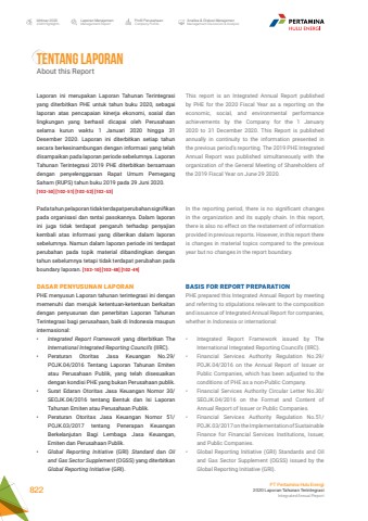 Ikhtisar 20202020 HighlightsLaporan ManajemenManagement ReportProfil PerusahaanCompany ProfileAnalisa & Diskusi ManajemenManagement Discussion & AnalysisPT Pertamina Hulu Energi2020 Laporan Tahunan TerintegrasiIntegrated Annual Report 822TENTANG LAPORANAbout this ReportLaporan ini merupakan Laporan Tahunan Terintegrasi yang diterbitkan PHE untuk tahun buku 2020, sebagai laporan atas pencapaian kinerja ekonomi, sosial dan lingkungan yang berhasil dicapai oleh Perusahaan selama kurun waktu 1 Januari 2020 hingga 31 Desember 2020. Laporan ini diterbitkan setiap tahun secara berkesinambungan dengan informasi yang telah disampaikan pada laporan periode sebelumnya. Laporan Tahunan Terintegrasi 2019 PHE diterbitkan bersamaan dengan penyelenggaraan Rapat Umum Pemegang Saham (RUPS) tahun buku 2019 pada 29 Juni 2020. [102-50] [102-51] [102-52] [102-53]Pada tahun pelaporan tidak terdapat perubahan signifikan pada organisasi dan rantai pasokannya. Dalam laporan ini juga tidak terdapat pengaruh terhadap penyajian kembali atas informasi yang diberikan dalam laporan sebelumnya. Namun dalam laporan periode ini terdapat perubahan pada topik material dibandingkan dengan tahun sebelumnya tetapi tidak terdapat perubahan pada boundary laporan. [102-10] [102-48] [102-49]DASAR PENYUSUNAN LAPORANPHE menyusun Laporan tahunan terintegrasi ini dengan memenuhi dan merujuk ketentuan-ketentuan berkaitan dengan penyusunan dan penerbitan Laporan Tahunan Terintegrasi bagi perusahaan, baik di Indonesia maupun internasional: %u2022 Integrated Report Framework yang diterbitkan The International Integrated Reporting Council%u2019s (IIRC). %u2022 Peraturan Otoritas Jasa Keuangan No.29/ POJK.04/2016 Tentang Laporan Tahunan Emiten atau Perusahaan Publik, yang telah disesuaikan dengan kondisi PHE yang bukan Perusahaan publik. %u2022 Surat Edaran Otoritas Jasa Keuangan Nomor 30/ SEOJK.04/2016 tentang Bentuk dan Isi Laporan Tahunan Emiten atau Perusahaan Publik. %u2022 Peraturan Otoritas Jasa Keuangan Nomor 51/ POJK.03/2017 tentang Penerapan Keuangan Berkelanjutan Bagi Lembaga Jasa Keuangan, Emiten dan Perusahaan Publik. %u2022 Global Reporting Initiative (GRI) Standard dan Oil and Gas Sector Supplement (OGSS) yang diterbitkan Global Reporting Initiative (GRI). This report is an Integrated Annual Report published by PHE for the 2020 Fiscal Year as a reporting on the economic, social, and environmental performance achievements by the Company for the 1 January 2020 to 31 December 2020. This Report is published annually in continuity to the information presented in the previous period%u2019s reporting. The 2019 PHE Integrated Annual Report was published simultaneously with the organization of the General Meeting of Shareholders of the 2019 Fiscal Year on June 29 2020. In the reporting period, there is no significant changes in the organization and its supply chain. In this report, there is also no effect on the restatement of information provided in previous reports. However, in this report there is changes in material topics compared to the previous year but no changes in the report boundary. BASIS FOR REPORT PREPARATIONPHE prepared this Integrated Annual Report by meeting and referring to stipulations relevant to the composition and issuance of Integrated Annual Report for companies, whether in Indonesia or international: %u2022 Integrated Report Framework issued by The International Integrated Reporting Council%u2019s (IIRC). %u2022 Financial Services Authority Regulation No.29/ POJK.04/2016 on the Annual Report of Issuer or Public Companies, which has been adjusted to the conditions of PHE as a non-Public Company. %u2022 Financial Services Authority Circular Letter No.30/ SEOJK.04/2016 on the Format and Content of Annual Report of Issuer or Public Companies. %u2022 Financial Services Authority Regulation No.51/ POJK.03/2017 on the Implementation of Sustainable Finance for Financial Services Institutions, Issuer, and Public Companies. %u2022 Global Reporting Initiative (GRI) Standards and Oil and Gas Sector Supplement (OGSS) issued by the Global Reporting Initiative (GRI).