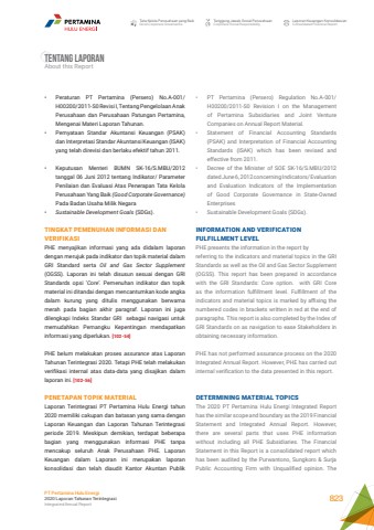 Tata Kelola Perusahaan yang BaikGood Corporate GovernanceTanggung Jawab Sosial PerusahaanCorporate Social ResponsibilityLaporan Keuangan KonsolidasianConsolidated Financial ReportPT Pertamina Hulu Energi2020 Laporan Tahunan TerintegrasiIntegrated Annual Report 823%u2022 Peraturan PT Pertamina (Persero) No.A-001/ H00200/2011-S0 Revisi I, Tentang Pengelolaan Anak Perusahaan dan Perusahaan Patungan Pertamina, Mengenai Materi Laporan Tahunan. %u2022 Pernyataan Standar Akuntansi Keuangan (PSAK) dan Interpretasi Standar Akuntansi Keuangan (ISAK) yang telah direvisi dan berlaku efektif tahun 2011. %u2022 Keputusan Menteri BUMN SK-16/S.MBU/2012 tanggal 06 Juni 2012 tentang Indikator/ Parameter Penilaian dan Evaluasi Atas Penerapan Tata Kelola Perusahaan Yang Baik (Good Corporate Governance)Pada Badan Usaha Milik Negara%u2022 Sustainable Development Goals (SDGs). TINGKAT PEMENUHAN INFORMASI DAN VERIFIKASIPHE menyajikan informasi yang ada didalam laporan dengan merujuk pada indikator dan topik material dalam GRI Standard serta Oil and Gas Sector Supplement(OGSS). Laporan ini telah disusun sesuai dengan GRI Standards opsi %u2018Core%u2019. Pemenuhan indikator dan topik material ini ditandai dengan mencantumkan kode angka dalam kurung yang ditulis menggunakan berwarna merah pada bagian akhir paragraf. Laporan ini juga dilengkapi Indeks Standar GRI sebagai navigasi untuk memudahkan Pemangku Kepentingan mendapatkan informasi yang diperlukan. [102-54] PHE belum melakukan proses assurance atas Laporan Tahunan Terintegrasi 2020. Tetapi PHE telah melakukan verifikasi internal atas data-data yang disajikan dalam laporan ini. [102-56] PENETAPAN TOPIK MATERIALLaporan Terintegrasi PT Pertamina Hulu Energi tahun 2020 memiliki cakupan dan batasan yang sama dengan Laporan Keuangan dan Laporan Tahunan Terintegrasi periode 2019. Meskipun demikian, terdapat beberapa bagian yang menggunakan informasi PHE tanpa mencakup seluruh Anak Perusahaan PHE. Laporan Keuangan dalam Laporan ini merupakan laporan konsolidasi dan telah diaudit Kantor Akuntan Publik %u2022 PT Pertamina (Persero) Regulation No.A-001/ H00200/2011-S0 Revision I on the Management of Pertamina Subsidiaries and Joint Venture Companies on Annual Report Material. %u2022 Statement of Financial Accounting Standards (PSAK) and Interpretation of Financial Accounting Standards (ISAK) which has been revised and effective from 2011. %u2022 Decree of the Minister of SOE SK-16/S.MBU/2012 dated June 6, 2012 concerning Indicators/ Evaluation and Evaluation Indicators of the Implementation of Good Corporate Governance in State-Owned Enterprises %u2022 Sustainable Development Goals (SDGs). INFORMATION AND VERIFICATION FULFILLMENT LEVELPHE presents the information in the report byreferring to the indicators and material topics in the GRI Standards as well as the Oil and Gas Sector Supplement (OGSS). This report has been prepared in accordance with the GRI Standards: Core option. with GRI Core as the information fulfillment level. Fulfillment of the indicators and material topics is marked by affixing the numbered codes in brackets written in red at the end of paragraphs. This report is also completed by the Index of GRI Standards on as navigation to ease Stakeholders in obtaining necessary information.PHE has not performed assurance process on the 2020 Integrated Annual Report. However, PHE has carried out internal verification to the data presented in this report.DETERMINING MATERIAL TOPICSThe 2020 PT Pertamina Hulu Energi Integrated Report has the similar scope and boundary as the 2019 Financial Statement and Integrated Annual Report. However, there are several parts that uses PHE information without including all PHE Subsidiaries. The Financial Statement in this Report is a consolidated report which has been audited by the Purwantono, Sungkoro & Surja Public Accounting Firm with Unqualified opinion. The Tentang LaporanAbout this Report