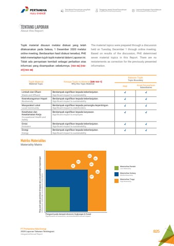 Tata Kelola Perusahaan yang BaikGood Corporate GovernanceTanggung Jawab Sosial PerusahaanCorporate Social ResponsibilityLaporan Keuangan KonsolidasianConsolidated Financial ReportPT Pertamina Hulu Energi2020 Laporan Tahunan TerintegrasiIntegrated Annual Report 825Tentang LaporanAbout this ReportTopik material disusun melalui diskusi yang telah dilaksanakan pada Selasa, 1 Desember 2020 melalui online meeting. Berdasarkan hasil diskusi tersebut, PHE telah menetapkan tujuh topik material dalam Laporan ini. Tidak ada pernyataan kembali sebagai perbaikan atas informasi yang disampaikan sebelumnya. [102-46] [102-47] [102-48]Topik MaterialMaterial TopicKenapa Topik ini Material [GRI 103-1]Why this Topic MaterialBatasan TopikTopic BoundaryPHE Anak PerusahaanSubsidiariesLimbah dan Efluen Waste and EffluentBerdampak signifikan kepada keberlanjutan.Significant impact to sustainability.%u221a %u221aKeanekaragaman Hayati BiodiversityBerdampak signifikan kepada keberlanjutan.Significant impact to sustainability.%u221a %u221aMasyarakat Lokal Local CommunityBerdampak signifikan kepada pemangku kepentingan.Significant impact to stakeholders.%u221a %u221aKesehatan dan Keselamatan KerjaOccupational Health and SafetyBerdampak signifikan kepada karyawan.Significant impact to employee.%u221a %u221aEmisi EmissionBerdampak signifikan kepada keberlanjutan.Significant impact to sustainability.%u221a %u221aEnergi EnergyBerdampak signifikan kepada keberlanjutan.Significant impact to sustainability.%u221a %u221aMatriks MaterialitasMateriality MatrixPengaruh pada penilaian & keputusan para pemangku kepentingan Influence on stakholder assessments & decisionsMaterialitas RendahLow MaterialityMaterialitas SedangMiddle MaterialityMaterialitas TinggiHigh MaterialityPengaruh pada dampak ekonomi, lingkungan & SosialSignificance of economic, environmental & social impact01020304050607The material topics were prepared through a discussion held on Tuesday, December 1 through online meeting. Based on results of the discussion, PHE determined seven material topics in this Report. There are no restatements as correction for the previously presented information.