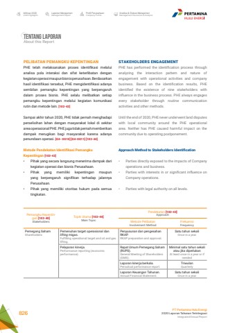 Ikhtisar 20202020 HighlightsLaporan ManajemenManagement ReportProfil PerusahaanCompany ProfileAnalisa & Diskusi ManajemenManagement Discussion & AnalysisPT Pertamina Hulu Energi2020 Laporan Tahunan TerintegrasiIntegrated Annual Report 826Tentang LaporanAbout this ReportPELIBATAN PEMANGKU KEPENTINGANPHE telah melaksanakan proses identifikasi melalui analisa pola interaksi dan sifat keterlibatan dengan kegiatan operasi maupun bisnis perusahaan. Berdasarkan hasil identifikasi tersebut, PHE mengidentifikasi adanya sembilan pemangku kepentingan yang berpengaruh dalam proses bisnis. PHE selalu melibatkan setiap pemangku kepentingan melalui kegiatan komunikasi rutin dan metode lain. [102-42]Sampai akhir tahun 2020, PHE tidak pernah menghadapi perselisihan lahan dengan masyarakat lokal di sekitar area operasional PHE. PHE juga tidak pernah memberikan dampak merugikan bagi masyarakat karena adanya penundaan operasi. [G4- OG10] [G4-OG11] [102-44]Metode Pendekatan Identifikasi Pemangku Kepentingan [102-42]%u2022 Pihak yang secara langsung menerima dampak dari kegiatan operasi dan bisnis Perusahaan.%u2022 Pihak yang memiliki kepentingan maupun yang berpengaruh signifikan terhadap jalannya Perusahaan.%u2022 Pihak yang memiliki otoritas hukum pada semua tingkatan.STAKEHOLDERS ENGAGEMENTPHE has performed the identification process through analyzing the interaction pattern and nature of engagement with operational activities and company business. Based on the identification results, PHE identified the existence of nine stakeholders with influence in the business process. PHE always engages every stakeholder through routine communication activities and other methods. Until the end of 2020, PHE never underwent land disputes with local community around the PHE operational area. Neither has PHE caused harmful impact on the community due to operating postponement.Approach Method to Stakeholders Identification%u2022 Parties directly exposed to the impacts of Company operations and business.%u2022 Parties with interests in or significant influence on Company operations.%u2022 Parties with legal authority on all levels.Pemangku Kepentingan [102-40]StakeholdersTopik Utama [102-44]Main TopicPendekatan [102-43]ApproachMetode PelibatanInvolvement MethodFrekuensiFrequencyPemegang SahamShareholdersPemenuhan target operasional dan lifting migas.Fulfilling operational target and oil and gas lifting.Penyusunan dan pengesahan RKAP.RKAP preparation and approval.Satu tahun sekaliOnce in a yearPelaporan kinerja.Performance reporting (economic performance).Rapat Umum Pemegang Saham (RUPS).General Meeting of Shareholders (GMS).Minimal satu tahun sekali atau jika diperlukanAt least once in a year or if neededLaporan kinerja berkala.Periodical performance report.TriwulanQuarterlyLaporan Keuangan Tahunan.Annual Financial Statement.Satu tahun sekaliOnce in a year