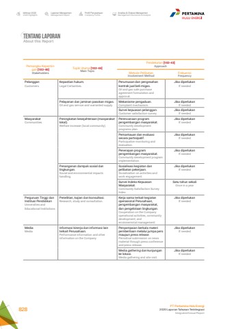Ikhtisar 20202020 HighlightsLaporan ManajemenManagement ReportProfil PerusahaanCompany ProfileAnalisa & Diskusi ManajemenManagement Discussion & AnalysisPT Pertamina Hulu Energi2020 Laporan Tahunan TerintegrasiIntegrated Annual Report 828Pemangku Kepentingan [102-40]StakeholdersTopik Utama [102-44]Main TopicPendekatan [102-43]ApproachMetode PelibatanInvolvement MethodFrekuensiFrequencyPelangganCustomersKepastian hukum.Legal Certainties.Perumusan dan pengesahan kontrak jual beli migas.Oil and gas sale purchase agreement formulation and approval.Jika diperlukanIf neededPelayanan dan jaminan pasokan migas.Oil and gas service and warranted supply.Mekanisme pengaduan.Complaint mechanism.Jika diperlukanIf neededSurvei kepuasan pelanggan.Customer satisfaction survey.Jika diperlukanIf neededMasyarakatCommunitiesPeningkatan kesejahteraan (masyarakatlokal).Welfare increase (local community).Perencanaan program pengembangan masyarakat.Community development programs plan.Jika diperlukanIf neededPemantauan dan evaluasi secara partisipatif.Participative monitoring and evaluation.Jika diperlukanIf neededPenerapan program pengembangan masyarakat.Community development program implementation.Jika diperlukanIf neededPenanganan dampak sosial dan lingkungan.Social and environmental impacts handling.Sosialisasi kegiatan dan pelibatan pekerjaan.Socialization on activities and work engagement.Jika diperlukanIf neededSurvei Indeks Kepuasan Masyarakat.Community Satisfaction Survey Index.Satu tahun sekaliOnce in a yearPerguruan Tinggi dan Institusi PendidikanUniversities and Educational InstitutionsPenelitian, kajian dan konsultasi.Research, study and consultation.Kerja sama terkait kegiatan operasional Perusahaan, pengembangan masyarakat,dan pengelolaan lingkungan.Cooperation on the Company operational activities, community development, andenvironemntal management.Jika diperlukanIf neededMediaMediaInformasi kinerja dan informasi lain terkait Perusahaan.Performance information and other information on the CompanyPenyampaian berkala materi pemberitaan melalui jumpa pers maupun press release.Periodical submission on news material through press conference and press release.Jika diperlukanIf neededMedia gathering dan kunjungan ke lokasi.Media gathering and site visit.Jika diperlukanIf neededTentang LaporanAbout this Report