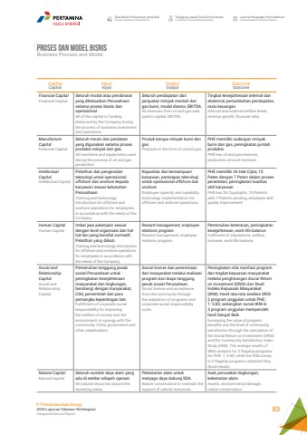 CapitalCapitalInputInputOutputOutputOutcomeOutcomeFinancial CapitalFinancial CapitalSeluruh modal atau pendanaan yang dikeluarkan Perusahaan selama proses bisnis dan operasional.All of the capital or funding disbursed by the Company during the process of business investment and operations.Seluruh pendapatan dari penjualan minyak mentah dan gas bumi, modal disetor, EBITDA.All revenues from oil and gas sale, paid-in capital, EBITDA.Tingkat kesejahteraan internal dan eksternal, pertumbuhan pendapatan, rasio keuangan.Internal and external welfare levels, revenue growth, financial ratio.Manufacture CapitalFinancial CapitalSeluruh mesin dan peralatan yang digunakan selama proses produksi minyak dan gas.All machines and equipments usedduring the process of oil and gasproduction.Produk berupa minyak bumi dan gas.Products in the form of oil and gas.PHE memiliki cadangan minyak bumi dan gas, peningkatan jumlah produksi.PHE has oil and gas reserves, production amount increase.Intellectual CapitalIntellectual CapitalPelatihan dan pengenalan teknologi untuk operasional offshore dan onshore kepada karyawan sesuai kebutuhan Perusahaan.Training and technology introduction for offshore and onshore operations for employees in accordance with the needs of the Company.Kapasitas dan kemampuan karyawan, penerapan teknologi untuk operasional offshore dan onshore.Employee capacity and capability, technology implementation for offshore and onshore operations.PHE memiliki 26 Hak Cipta, 15 Paten dengan 7 Paten dalam proses penerbitan, peningkatan kualitas skill karyawanPHE has 26 Copyrights, 15 Patents with 7 Patents pending, employee skill quality improvementHuman CapitalHuman CapitalImbal jasa pekerjaan sesuai dengan level organisasi dan halhal lain yang bersifat normatif. Pelatihan yang diikuti.Training and technology introduction for offshore and onshore operations for employees in accordance with the needs of the Company.Reward management, employee relations program.Reward management, employee relations program.Pemenuhan ketentuan, peningkatan kesejahteraan, work-life balance.Fulfilment of stipulations, welfare increase, work-life balance.Social and Relationship CapitalSocial and Relationship CapitalPemenuhan tanggung jawab sosial Perusahaan untuk peningkatan kesejahteraan masyarakat dan lingkungan, bersinergi dengan masyarakat, CSO, pemerintah dan para pemangku kepentingan lain.Fulfillment of corporate social responsibility for improving the welfare of society and the environment, in synergy with the community, CSOs, government and other stakeholders.Social license dan penerimaan dari masyarakat melalui realisasi program dan biaya tanggung jawab sosial Perusahaan.Social license and acceptance from the community through the realization of programs and corporate social responsibility costs.Peningkatan nilai manfaat program dan tingkat kepuasan masyarakat melalui penghitungan Social Return on Investment (SROI) dan Studi Indeks Kepuasan Masyarakat (IKM). Hasil rata-rata analisis SROI 2 program unggulan untuk PHE: 1: 5.80; sedangkan survei IKM di 3 program unggulan memperoleh hasil Sangat Baik.Increasing the value of program benefits and the level of community satisfaction through the calculation of the Social Return on Investment (SROI) and the Community Satisfaction Index Study (IKM). The average results of SROI analysis for 2 flagship programs for PHE: 1: 5.80; while the IKM survey in 3 flagship programs obtained Very Good results.Natural CapitalNatural CapitalSeluruh sumber daya alam yang ada di sekitar wilayah operasi.All natural resources around theoperating areas.Pelestarian alam untukmenjaga daya dukung SDA.Nature conservation to maintain the support of natural resources.Aset, perusakan lingkungan, kelestarian alam.Assets, environmental damage,nature conservation.Tata Kelola Perusahaan yang BaikGood Corporate GovernanceTanggung Jawab Sosial PerusahaanCorporate Social ResponsibilityLaporan Keuangan KonsolidasianConsolidated Financial ReportPT Pertamina Hulu Energi2020 Laporan Tahunan TerintegrasiIntegrated Annual Report 83PROSES DAN MODEL BISNISBusiness Process and Model