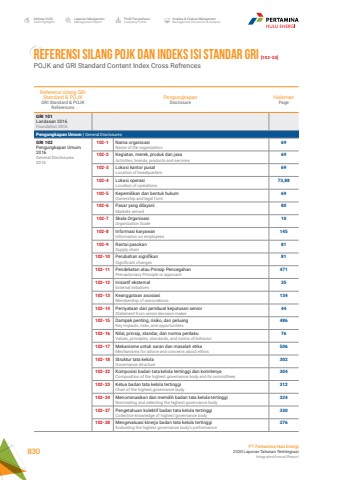 REFERENSI SILANG POJK DAN INDEKS ISI STANDAR GRI [102-55]POJK and GRI Standard Content Index Cross RefrencesReferensi silang GRIStandard & POJKGRI Standard & POJKReferencesPengungkapanDisclosureHalamanPageGRI 101Landasan 2016Foundation 2016Pengungkapan Umum | General DisclosuresGRI 102Pengungkapan Umum2016General Disclosures2016102-1 Nama organisasiName of the organization69102-2 Kegiatan, merek, produk dan jasaActivities, brands, products and services69102-3 Lokasi kantor pusatLocation of headquarters69102-4 Lokasi operasiLocation of operations73,88102-5 Kepemilikan dan bentuk hukumOwnership and legal form69102-6 Pasar yang dilayaniMarkets served80102-7 Skala OrganisasiOrganization Scale10102-8 Informasi karyawanInformation on employees145102-9 Rantai pasokanSupply chain81102-10 Perubahan signifikanSignificant changes81102-11 Pendekatan atau Prinsip PencegahanPrecautionary Principle or approach471102-12 Inisiatif eksternalExternal initiatives35102-13 Keanggotaan asosiasiMembership of associations134102-14 Pernyataan dari pembuat keputusan seniorStatement from senior decision-maker44102-15 Dampak penting, risiko, dan peluangKey impacts, risks, and opportunities486102-16 Nilai, prinsip, standar, dan norma perilakuValues, principles, standards, and norms of behavior76102-17 Mekanisme untuk saran dan masalah etikaMechanisms for advice and concerns about ethics506102-18 Struktur tata kelolaGovernance structure302102-22 Komposisi badan tata kelola tertinggi dan komitenyaComposition of the highest governance body and its committees304102-23 Ketua badan tata kelola tertinggiChair of the highest governance body312102-24 Menominasikan dan memilih badan tata kelola tertinggiNominating and selecting the highest governance body324102-27 Pengetahuan kolektif badan tata kelola tertinggiCollective knowledge of highest governance body330102-28 Mengevaluasi kinerja badan tata kelola tertinggiEvaluating the highest governance body%u2019s performance376Ikhtisar 20202020 HighlightsLaporan ManajemenManagement ReportProfil PerusahaanCompany ProfileAnalisa & Diskusi ManajemenManagement Discussion & AnalysisPT Pertamina Hulu Energi2020 Laporan Tahunan TerintegrasiIntegrated Annual Report 830