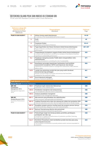 Referensi silang GRIStandard & POJKGRI Standard & POJKReferencesPengungkapanDisclosureHalamanPagePOJK 51/OJK.03/2017 2 Ikhtisar kinerja aspek keberlanjutanAn overview of the sustainability performance aspect10-203 ProfilProfile694 Penjelasan DireksiExplanation of the Board of Directors52-615.a Tugas bagi Direksi dan Dewan Komisaris terkait kinerja keberlanjutanBoard of Directors and Board of Commissioners duties on sustainability performance327, 3475.b Pengembangan kompetensi anggota Direksi terkait kinerja berkelanjutanCompetencies development carried out on members of the Board of Directors regarding to sustainability performance3535.c Penjelasan mengenai prosedur Publik dalam mengendalikan risiko keberkelanjutanCompany procedures in controlling the risk of sustainability4715.d Keterlibatan pemangku kepentingan berdasarkan hasil penilaian (assessment) manajemen, RUPS, surat keputusan atau lainnyaStakeholder involvement based on management assessment, GMS, decision letter or other8266.f.2 Jumlah dan persentase produk dan jasa yang sudah dievaluasi keamanannya bagi pelangganNumber and percentage of products and services that have beenevaluated for the customer%u2019s safety6616.f.2 Survei kepuasan pelangganSurvey of customer satisfaction664Topik Material | Material TopicsKinerja Ekonomi | Economic PerformanceGRI 103PendekatanManajemen 2016Management Approach 2016103-1 Penjelasan topik material dan BatasannyaExplanation of the material topics288103-2 Pendekatan manajemen dan komponennyaThe management approach and its components288103-3 Evaluasi pendekatan manajemenEvaluation of the management approach288GRI 201Kinerja Ekonomi 2016Economic Performance 2016201-1 Nilai ekonomi yang dihasilkan dan didistribusikanDirect economic value generated and distributed288201-2 Implikasi finansial serta risiko dan peluang lain akibat dari perubahan iklimFinancial implications and other risks and opportunities due to climate change288201-3 Kewajiban program pensiun manfaat pasti dan program pension lainnyaDefined benefit plan obligations and other retirement plans290201-4 Bantuan finansial yang diterima dari pemerintahFinancial assistance received from government288POJK 51/OJK.03/2017 6.b.1 Perbandingan target dan kinerja produksi, portofolio, pembiayaan, pendapatan dan laba rugiComparison of targets and performance of production, portfolio, financing, income and profit and loss2586.c.1 Komitmen Perusahaan untuk memberikan produk dan/atau jasa yang setara kepada konsumenThe Company's commitment to provide products and/or services equivalent to consumers653Referensi silang POJK dan Indeks Isi Standar GRIPOJK and GRI Standard Content Index Cross RefrencesIkhtisar 20202020 HighlightsLaporan ManajemenManagement ReportProfil PerusahaanCompany ProfileAnalisa & Diskusi ManajemenManagement Discussion & AnalysisPT Pertamina Hulu Energi2020 Laporan Tahunan TerintegrasiIntegrated Annual Report 832