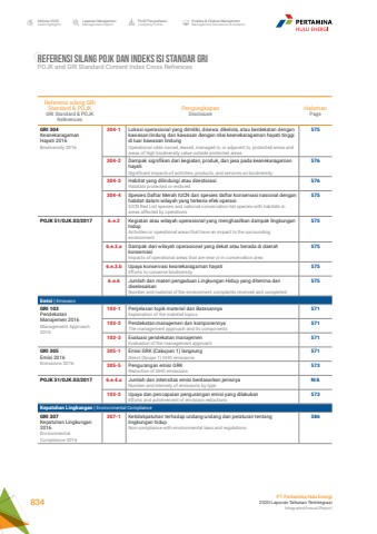 Referensi silang GRIStandard & POJKGRI Standard & POJKReferencesPengungkapanDisclosureHalamanPageGRI 304KeanekaragamanHayati 2016Biodiversity 2016304-1 Lokasi operasional yang dimiliki, disewa, dikelola, atau berdekatan dengan kawasan lindung dan kawasan dengan nilai keanekaragaman hayati tinggi di luar kawasan lindungOperational sites owned, leased, managed in, or adjacent to, protected areas and areas of high biodiversity value outside protected areas575304-2 Dampak signifikan dari kegiatan, produk, dan jasa pada keanekaragaman hayatiSignificant impacts of activities, products, and services on biodiversity576304-3 Habitat yang dilindungi atau direstorasiHabitats protected or restored576304-4 Spesies Daftar Merah IUCN dan spesies daftar konservasi nasional dengan habitat dalam wilayah yang terkena efek operasiIUCN Red List species and national conservation list species with habitats in areas affected by operations575POJK 51/OJK.03/2017 6.e.2 Kegiatan atau wilayah operasional yang menghasilkan dampak lingkungan hidupActivities or operational areas that have an impact to the surrounding environment5756.e.3.a Dampak dari wilayah operasional yang dekat atau berada di daerah konservasiImpacts of operational areas that are near or in conservation area5756.e.3.b Upaya konservasi keanekaragaman hayatiEfforts to conserve biodiversity5756.e.6 Jumlah dan materi pengaduan Lingkungan Hidup yang diterima dan diselesaikanNumber and material of the environment complaints received and completed575Emisi | EmissionGRI 103PendekatanManajemen 2016Management Approach 2016103-1 Penjelasan topik material dan BatasannyaExplanation of the material topics571103-2 Pendekatan manajemen dan komponennyaThe management approach and its components571103-3 Evaluasi pendekatan manajemenEvaluation of the management approach571GRI 305Emisi 2016Emissions 2016305-1 Emisi GRK (Cakupan 1) langsungDirect (Scope 1) GHG emissions571305-5 Pengurangan emisi GRKReduction of GHG emissions573POJK 51/OJK.03/2017 6.e.4.a Jumlah dan intensitas emisi berdasarkan jenisnyaNumber and intensity of emissions by typeN/A103-2 Upaya dan pencapaian pengurangan emisi yang dilakukanEfforts and achievement of emission reductions573Kepatuhan Lingkungan | Environmental ComplianceGRI 307Kepatuhan Lingkungan 2016EnvironmentalCompliance 2016307-1 Ketidakpatuhan terhadap undang-undang dan peraturan tentang lingkungan hidupNon-compliance with environmental laws and regulations586Referensi silang POJK dan Indeks Isi Standar GRIPOJK and GRI Standard Content Index Cross RefrencesIkhtisar 20202020 HighlightsLaporan ManajemenManagement ReportProfil PerusahaanCompany ProfileAnalisa & Diskusi ManajemenManagement Discussion & AnalysisPT Pertamina Hulu Energi2020 Laporan Tahunan TerintegrasiIntegrated Annual Report 834