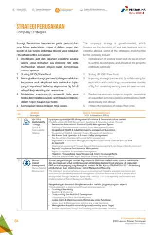 STRATEGI PERUSAHAANCompany StrategiesNo StrategiStrategiesUpaya Pencapaian 20202020 Achievement Effort1 QHSSE & Sustainability StrategyQHSSE & Sustainability StrategyUpaya pencapaian QHSSE Management Excellence & Generative culture melalui : Efforts to achieve QHSSE Management Excellence & Generative culture through: %u2022 Pemenuhan International Standard Quality Management System.Fullfilling of the International Standard Quality Management System.%u2022 Occupational Health & Industrial Hygiene Management Excellence.Occupational Health & Industrial Hygiene Management Excellence.%u2022 Risk Based Safe Operation & Process Safety Management.Risk Based Safe Operation & Process Safety Management.%u2022 Organization Involvement Through Security Risk Assessment to Create Secure Work Environment.Organization Involvement Through Security Risk Assessment to Create Secure Work Environment.%u2022 Beyond Compliance Environmental Management.Beyond Compliance Environmental Management.%u2022 Proactive, Preparedness, Rapid Response & Timely Recovery Efforts.Proactive, Preparedness, Rapid Response & Timely Recovery Efforts.2 Human Capital DevelopmentHuman Capital DevelopmentStrategi pengembangan sumber daya manusia dilakukan melalui suatu standar mekanisme dan kelembagaan untuk pembinaan dan pengelolaan Sumber Daya Manusia di lingkungan PHE secara berjenjang yang ditetapkan melalui SK No. Kptsp.-058/PHE000/2017-S8 tentang pembentukan dan implementasi Talent Management Meeting.The strategy of developing human resources is carried out through a standard mechanism and institutions for the development and management of Human Resources in PHE in stages which are stipulated through Decree No. Kptsp.-058 / PHE000 / 2017-S8 regarding the formation and implementation of Talent Management Meeting.Pengembangan dimaksud diimplementasikan melalui program-program seperti:This development is implemented through programs such as:%u2022 Coaching & Mentoring.Coaching & Mentoring.%u2022 Cross-posting dan Multi Skill Development.Cross-posting and Multi Skill Development.%u2022 Lesson learn & Sharing session internal atau cross functional.Lesson learn & Sharing session internal atau cross functional.%u2022 Meningkatkan kapabilitas melalui proses funneling antar fungsi.Increase capabilities through the funneling process between functions.Laporan ManajemenManagement ReportProfil PerusahaanCompany ProfileAnalisa & Diskusi ManajemenManagement Discussion & AnalysisIkhtisar 20202020 HighlightsPT Pertamina Hulu Energi2020 Laporan Tahunan TerintegrasiIntegrated Annual Report 84Strategi Perusahaan berorientasi pada pertumbuhan yang fokus pada bisnis migas di dalam negeri dan selektif di luar negeri. Beberapa strategi yang dilakukan Perusahaan antara lain adalah:1. Revitalisasi aset dan lapangan eksisting sebagai upaya untuk menahan laju declining rate serta memastikan seluruh project dapat berkontribusi secara optimum.2. Scaling UP IOR/Waterflood.3. Meningkatkan strategic partnership dengan melakukan kerjasama untuk eksplorasi serta melakukan kajian yang komprehensif terhadap eksploration big fish di wilayah kerja eksisting dan new venture.4. Melakukan proyek-proyek anorganik hulu yang terdiri dari kegiatan akuisisi (aset maupun korporat) dalam negeri maupun luar negeri.5. Menyiapkan transisi Wilayah Kerja Rokan.The company%u2019s strategy is growth-oriented, which focuses on the domestic oil and gas business and is selective abroad. Some of the strategies implemented by the Company include:1. Revitalization of existing asset and site as an effort to control declining rate and ensure all the projects contribute optimally.2. Scaling UP IOR/ Waterflood.3. Improving strategic partnership by collaborating for exploration and conducting comprehensive studies of big fish in existing working area and new venture. 4. Conducting upstream inorganic projects consisting of acquisition activities (assets and corporate) both domestically and abroad.5. Prepare the transition of Rokan Work Area.