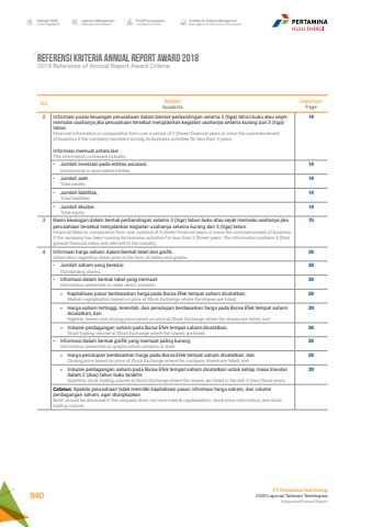 No MateriSuspectsHalamanPage2 Informasi posisi keuangan perusahaan dalam bentuk perbandingan selama 3 (tiga) tahun buku atau sejak memulai usahanya jika perusahaan tersebut menjalankan kegiatan usahanya selama kurang dari 3 (tiga) tahun.Financial information in comparative form over a period of 3 (three) financial years or since the commencementof business if the company has been running its business activities for less than 3 years.Informasi memuat antara lain :The information contained includes :14%u2022 Jumlah investasi pada entitas asosiasi.Investments in associated entities.14%u2022 Jumlah aset.Total assets.14%u2022 Jumlah liabilitas.Total liabilities.14%u2022 Jumlah ekuitas.Total equity.143 Rasio keuangan dalam bentuk perbandingan selama 3 (tiga) tahun buku atau sejak memulai usahanya jika perusahaan tersebut menjalankan kegiatan usahanya selama kurang dari 3 (tiga) tahun.Financial Ratio in comparative form over a period of 3 (three) financial years or since the commencement of business if the company has been running its business activities for less than 3 (three) years. The information contains 5 (five) general financial ratios and relevant to the industry.154 Informasi harga saham dalam bentuk tabel dan grafik.Information regarding share price in the form of tables and graphs.20%u2022 Jumlah saham yang beredar.Outstanding shares.20%u2022 Informasi dalam bentuk tabel yang memuat:Information presented on table which contains:20%u00bb Kapitalisasi pasar berdasarkan harga pada Bursa Efek tempat saham dicatatkan;Market capitalisation based on price at Stock Exchange where the shares are listed;20%u00bb Harga saham tertinggi, terendah, dan penutupan berdasarkan harga pada Bursa Efek tempat saham dicatatkan; danHighest, lowest and closing price based on price at Stock Exchange where the shares are listed; and20%u00bb Volume perdagangan saham pada Bursa Efek tempat saham dicatatkan.Stock trading volume at Stock Exchange where the shares are listed.20%u2022 Informasi dalam bentuk grafik yang memuat paling kurang:Information presented on graphs which contains at least:20%u00bb Harga penutupan berdasarkan harga pada Bursa Efek tempat saham dicatatkan; danClosing price based on price at Stock Exchange where the company shares are listed; and20%u00bb Volume perdagangan saham pada Bursa Efek tempat saham dicatatkan untuk setiap masa triwulan dalam 2 (dua) tahun buku terakhir.Quarterly stock trading volume at Stock Exchange where the shares are listed in the last 2 (two) fiscal years.20Catatan: Apabila perusahaan tidak memiliki kapitalisasi pasar, informasi harga saham, dan volume perdagangan saham, agar diungkapkanNote: should be disclosed if the company does not have market capitalisation, stock price information, and stock trading volume.Referensi Kriteria Annual Report Award 20182018 Reference of Annual Report Award CriteriaIkhtisar 20202020 HighlightsLaporan ManajemenManagement ReportProfil PerusahaanCompany ProfileAnalisa & Diskusi ManajemenManagement Discussion & AnalysisPT Pertamina Hulu Energi2020 Laporan Tahunan TerintegrasiIntegrated Annual Report 840