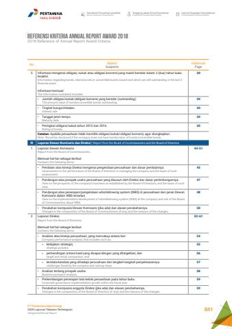 Referensi Kriteria Annual Report Award 20182018 Reference of Annual Report Award CriteriaNo MateriSuspectsHalamanPage5 Informasi mengenai obligasi, sukuk atau obligasi konversi yang masih beredar dalam 2 (dua) tahun buku terakhir.Information regarding bonds, sharia bonds or convertible bonds issued and which are still outstanding in the last 2 financial years.Informasi memuat:The information contained includes:20%u2022 Jumlah obligasi/sukuk/obligasi konversi yang beredar (outstanding).The amount/value of bonds/convertible bonds outstanding.20%u2022 Tingkat bunga/imbalan.Interest rate.20%u2022 Tanggal jatuh tempo.Maturity date.20%u2022 Peringkat obligasi/sukuk tahun 2015 dan 2016.Rating of bonds.20Catatan: Apabila perusahaan tidak memiliki obligasi/sukuk/obligasi konversi, agar diungkapkan.Note: Should be disclosed if the company does not have bonds/value of bonds/convertible bonds.III Laporan Dewan Komisaris dan Direksi | Report from the Board of Commissioners and the Board of Directors1 Laporan Dewan Komisaris.Report from the Board of Commissioners.Memuat hal-hal sebagai berikut:Contains the following items:44-51%u2022 Penilaian atas kinerja Direksi mengenai pengelolaan perusahaan dan dasar penilaiannya.Assessment on the performance of the Board of Directors in managing the company and the basis of such assessment.45%u2022 Pandangan atas prospek usaha perusahaan yang disusun oleh Direksi dan dasar pertimbangannya.View on the prospects of the company%u2019s business as established by the Board of Directors, and the basis of such view.47%u2022 Pandangan atas penerapan/pengelolaan whistleblowing system (WBS) di perusahaan dan peran Dewan Komisaris dalam WBS tersebut.View on the implementation/development of whistleblowing system (WBS) at the company and role of the Board of Commissioners about WBS.48%u2022 Perubahan komposisi Dewan Komisaris (jika ada) dan alasan perubahannya.Changes in the composition of the Board of Commissioners (if any) and the reasons of the changes.502 Laporan Direksi.Report from the Board of Directors.Memuat hal-hal sebagai berikut:Contains the following items:52-61%u2022 Analisis atas kinerja perusahaan, yang mencakup antara lain:Company performance analysis, that includes such as:54%u00bb kebijakan strategis;strategic policies;55%u00bb perbandingan antara hasil yang dicapai dengan yang ditargetkan; dantarget and result comparison; and56%u00bb kendala-kendala yang dihadapi perusahaan dan langkah-langkah penyelesaiannya.challenges faced by the company and solving steps.57%u2022 Analisis tentang prospek usaha.Business prospect analysis.58%u2022 Perkembangan penerapan tata kelola perusahaan pada tahun buku.Corporate governance implementation growth within the fiscal year.59%u2022 Perubahan komposisi anggota Direksi (jika ada) dan alasan perubahannya.Changes in the composition of the Board of Directors (if any) and the reasons of the changes.59Tata Kelola Perusahaan yang BaikGood Corporate GovernanceTanggung Jawab Sosial PerusahaanCorporate Social ResponsibilityLaporan Keuangan KonsolidasianConsolidated Financial ReportPT Pertamina Hulu Energi2020 Laporan Tahunan TerintegrasiIntegrated Annual Report 841