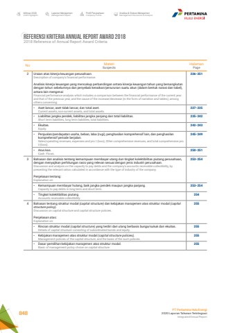 Referensi Kriteria Annual Report Award 20182018 Reference of Annual Report Award CriteriaNo MateriSuspectsHalamanPage2 Uraian atas kinerja keuangan perusahaan.Description of company%u2019s financial performance.Analisis kinerja keuangan yang mencakup perbandingan antara kinerja keuangan tahun yang bersangkutan dengan tahun sebelumnya dan penyebab kenaikan/penurunan suatu akun (dalam bentuk narasi dan tabel), antara lain mengenai:Financial performance analysis which includes a comparison between the financial performance of the current year and that of the previous year, and the cause of the increase/decrease (in the form of narration and tables), among others concerning:226-251%u2022 Aset lancar, aset tidak lancar, dan total aset.Current assets, non-current assets, and total assets.227-235%u2022 Liabilitas jangka pendek, liabilitas jangka panjang dan total liabilitas.Short term liabilities, long term liabilities, total liabilities.235-242%u2022 Ekuitas.Equity.242-243%u2022 Penjualan/pendapatan usaha, beban, laba (rugi), penghasilan komprehensif lain, dan penghasilan komprehensif periode berjalan.Sales/operating revenues, expenses and pro t (loss), Other comprehensive revenues, and total comprehensive pro t/(loss).245-249%u2022 Arus kas.Cash Flows.250-2513 Bahasan dan analisis tentang kemampuan membayar utang dan tingkat kolektibilitas piutang perusahaan, dengan menyajikan perhitungan rasio yang relevan sesuai dengan jenis industri perusahaan.Discussion and analysis on the capacity to pay debts and the company%u2019s accounts receivable collectibility, by presenting the relevant ratios calculated in accordance with the type of industry of the company.Penjelasan tentang:Explanation on:253-254%u2022 Kemampuan membayar hutang, baik jangka pendek maupun jangka panjang.Capacity to pay debts in long term and short term.253-254%u2022 Tingkat kolektibilitas piutang.Accounts receivable collectibility.2544 Bahasan tentang struktur modal (capital structure) dan kebijakan manajemen atas struktur modal (capital structure policy).Discussion on capital structure and capital structure policies.Penjelasan atas:Explanation on:255%u2022 Rincian struktur modal (capital structure) yang terdiri dari utang berbasis bunga/sukuk dan ekuitas.Details of capital structure consisting of subordinated bonds and equity.255%u2022 Kebijakan manajemen atas struktur modal (capital structure policies).Management policies of the capital structure, and the basis of the such policies.255%u2022 Dasar pemilihan kebijakan manajemen atas struktur modal.Basic of management policy choice on capital structure.255Ikhtisar 20202020 HighlightsLaporan ManajemenManagement ReportProfil PerusahaanCompany ProfileAnalisa & Diskusi ManajemenManagement Discussion & AnalysisPT Pertamina Hulu Energi2020 Laporan Tahunan TerintegrasiIntegrated Annual Report 848