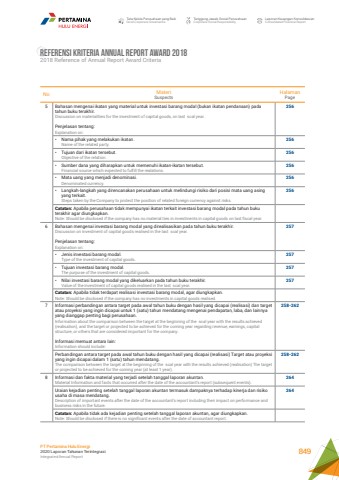 Referensi Kriteria Annual Report Award 20182018 Reference of Annual Report Award CriteriaNo MateriSuspectsHalamanPage5 Bahasan mengenai ikatan yang material untuk investasi barang modal (bukan ikatan pendanaan) pada tahun buku terakhir.Discussion on materialities for the investment of capital goods, on last scal year.Penjelasan tentang:Explanation on:256%u2022 Nama pihak yang melakukan ikatan.Name of the related party.256%u2022 Tujuan dari ikatan tersebut.Objective of the relation.256%u2022 Sumber dana yang diharapkan untuk memenuhi ikatan-ikatan tersebut.Financial source which expected to fulfill the realations.256%u2022 Mata uang yang menjadi denominasi.Denominated currency.256%u2022 Langkah-langkah yang direncanakan perusahaan untuk melindungi risiko dari posisi mata uang asing yang terkait.Steps taken by the Company to protect the position of related foreign currency against risks.256Catatan: Apabila perusahaan tidak mempunyai ikatan terkait investasi barang modal pada tahun buku terakhir agar diungkapkan.Note: Should be disclosed if the company has no material ties in investments in capital goods on last fiscal year.6 Bahasan mengenai investasi barang modal yang direalisasikan pada tahun buku terakhir.Discussion on investment of capital goods realised in the last scal year.Penjelasan tentang:Explanation on:257%u2022 Jenis investasi barang modal.Type of the investment of capital goods.257%u2022 Tujuan investasi barang modal.The purpose of the investment of capital goods.257%u2022 Nilai investasi barang modal yang dikeluarkan pada tahun buku terakhir.Value of the investment of capital goods realised in the last scal year.257Catatan: Apabila tidak terdapat realisasi investasi barang modal, agar diungkapkan.Note: Should be disclosed if the company has no investments in capital goods realised.7 Informasi perbandingan antara target pada awal tahun buku dengan hasil yang dicapai (realisasi) dan target atau proyeksi yang ingin dicapai untuk 1 (satu) tahun mendatang mengenai pendapatan, laba, dan lainnya yang dianggap penting bagi perusahaan.Information about the comparison between the target at the beginning of the scal year with the results achieved (realisation), and the target or projected to be achieved for the coming year regarding revenue, earnings, capital structure, or others that are considered important for the company.Informasi memuat antara lain:Information should include:258-262Perbandingan antara target pada awal tahun buku dengan hasil yang dicapai (realisasi) Target atau proyeksi yang ingin dicapai dalam 1 (satu) tahun mendatang.The comparison between the target at the beginning of the scal year with the results achieved (realisation) The target or projected to be achieved for the coming year (at least 1 year).258-2628 Informasi dan fakta material yang terjadi setelah tanggal laporan akuntan.Material Information and facts that occurred after the date of the accountant%u2019s report (subsequent events).264Uraian kejadian penting setelah tanggal laporan akuntan termasuk dampaknya terhadap kinerja dan risiko usaha di masa mendatang.Description of important events after the date of the accountant%u2019s report including their impact on performance and business risks in the future.264Catatan: Apabila tidak ada kejadian penting setelah tanggal laporan akuntan, agar diungkapkan.Note: Should be disclosed if there is no significant events after the date of accountant report.Tata Kelola Perusahaan yang BaikGood Corporate GovernanceTanggung Jawab Sosial PerusahaanCorporate Social ResponsibilityLaporan Keuangan KonsolidasianConsolidated Financial ReportPT Pertamina Hulu Energi2020 Laporan Tahunan TerintegrasiIntegrated Annual Report 849