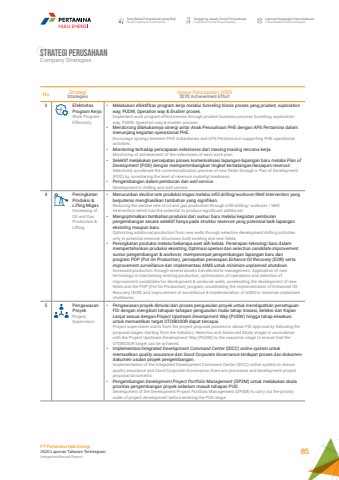 STRATEGI PERUSAHAANCompany StrategiesNo StrategiStrategiesUpaya Pencapaian 20202020 Achievement Effort3 Efektivitas Program KerjaWork Program Effectivity%u2022 Melakukan efektifitas program kerja melalui funneling bisnis proses yang prudent, exploration way, PUDW, Operation way & Enabler proses.Implement work program effectiveness through prudent business process funneling, exploration way, PUDW, Operation way & enabler process.%u2022 Mendorong dilakukannya sinergi antar Anak Perusahaan PHE dengan APS Pertamina dalam menunjang kegiatan operasional PHE.Encourage synergy between PHE Subsidiaries and APS Pertamina in supporting PHE operational activities.%u2022 Monitoring terhadap pencapaian milestones dari masing-masing rencana kerja.Monitoring of achievement of the milestones of each work plan.%u2022 Selektif melakukan percepatan proses komersialisasi lapangan-lapangan baru melalui Plan of Development (POD) dengan mempertimbangkan tingkat kematangan/kesiapan reservoir.Selectively accelerate the commercialization process of new fields through a Plan of Development (POD) by considering the level of reservoir maturity/readiness.%u2022 Pengembangan dalam pemboran dan well service.Development in drilling and well service.4 Peningkatan Produksi & Lifting MigasIncreasing of Oil and Gas Production & Lifting%u2022 Menurunkan decline rate produksi migas melalui infill drilling/workover/Well Intervention yang berpotensi menghasilkan tambahan yang signifikan.Reducing the decline rate of oil and gas production through infill drilling/ workover / Well Intervention which has the potential to produce significant additional.%u2022 Mengoptimalkan tambahan produksi dari sumur baru melalui kegiatan pemboran pengembangan secara selektif hanya pada struktur reservoir yang potensial baik lapangan eksisting maupun baru.Optimizing additional production from new wells through selective development drilling activities only in potential reservoir structures, both existing and new fields.%u2022 Peningkatan produksi melalui beberapa aset alih kelola. Penerapan teknologi baru dalam mempertahankan produksi eksisting, Optimasi operasi dan selection candidate improvement sumur pengembangan & workover, mempercepat pengembangan lapangan baru dan program POP (Put On Production), percepatan penerapan Enhance Oil Recovery (EOR) serta improvement surveillance dan implementasi AIMS untuk minimize unplanned shutdown.Increased production through several assets transferred to management. Application of new technology in maintaining existing production, optimization of operations and selection of improvement candidates for development & workover wells, accelerating the development of new fields and the POP (Put On Production) program, accelerating the implementation of Enhanced Oil Recovery (EOR) and improvement of surveillance & implementation of AIMS to minimize unplanned shutdowns.5 Pengawasan ProyekProject Supervision%u2022 Pengawasan proyek dimulai dari proses pengusulan proyek untuk mendapatkan persetujuan FID dengan mengikuti tahapan-tahapan pengusulan mulai tahap Inisiasi, Seleksi dan Kajian Lanjut sesuai dengan Project Upstream Development Way (PUDW) hingga tahap eksekusi untuk memastikan target OTOBOSOR dapat tercapai.Project supervision starts from the project proposal process to obtain FID approval by following the proposal stages starting from the Initiation, Selection and Advanced Study stages in accordance with the Project Upstream Development Way (PUDW) to the execution stage to ensure that the OTOBOSOR target can be achieved.%u2022 Implementasi Integrated Development Command Center (IDCC) online system untuk memastikan quality assurance dan Good Corporate Governance terdapat proses dan dokumendokumen usulan proyek pengembangan.Implementation of the Integrated Development Command Center (IDCC) online system to ensure quality assurance and Good Corporate Governance, there are processes and development project proposal documents.%u2022 Pengembangan Development Project Portfolio Management (DP2M) untuk melakukan skala prioritas pengembangan proyek sebelum masuk tahapan PUD.Development of the Development Project Portfolio Management (DP2M) to carry out the priority scale of project development before entering the PUD stage.Tata Kelola Perusahaan yang BaikGood Corporate GovernanceTanggung Jawab Sosial PerusahaanCorporate Social ResponsibilityLaporan Keuangan KonsolidasianConsolidated Financial ReportPT Pertamina Hulu Energi2020 Laporan Tahunan TerintegrasiIntegrated Annual Report 85