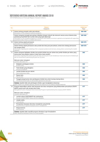 Referensi Kriteria Annual Report Award 20182018 Reference of Annual Report Award CriteriaNo MateriSuspectsHalamanPage9 Uraian tentang prospek usaha perusahaan.Description of the company%u2019s business prospects.265-269Uraian mengenai prospek perusahaan dikaitkan dengan industri dan ekonomi secara umum disertai data pendukung kuantitatif dari sumber data yang layak dipercaya.Information on the company prospects in connection with industry, economy in general, accompanied with supporting quantitative data if there is a reliable data source.265-26910 Uraian tentang aspek pemasaran.Information on marketing aspects.269-272Uraian tentang aspek pemasaran atas produk dan/atau jasa perusahaan, antara lain strategi pemasaran dan pangsa pasar.Information regarding the marketing of the company%u2019s products and services, among others concerning the marketsegment.269-27211 Uraian mengenai kebijakan dividen dan jumlah dividen kas per saham dan jumlah dividen per tahun yang diumumkan atau dibayar selama 2 (dua) tahun buku terakhir.Description regarding the dividend policy the date and amount of cash dividend per share and amount of dividend per year as announced or paid during the past two (2) years.Memuat uraian mengenai:Contains description on:263%u2022 Kebijakan pembagian dividen.Dividen policy.263%u2022 Total dividen yang dibagikan.Amount of dividend.263%u2022 Jumlah dividen kas per saham.Cash dividend per share.263%u2022 Payout ratio.Pay-out ratio.263%u2022 Tanggal pengumuman dan pembayaran dividen kas untuk masing-masing tahun.The announcement date of cash dividen payment for each year.263Catatan: Apabila tidak ada pembagian dividen, agar diungkapkan alasannya.Note: If there is no dividend payment, disclose the reasons for not making a dividend payment.12 Program kepemilikan saham oleh karyawan dan/atau manajemen yang dilaksanakan perusahaan (ESOP/MSOP) yang masih ada sampai tahun buku.Management and/or Employee Stock Ownership Program implemented by the company (ESOP/ MSOP).Memuat uraian mengenai:Contains description on:277%u2022 Jumlah saham ESOP/MSOP dan realisasinya.Amount of ESOP/MSOP shares and the realisation.277%u2022 Jangka waktu.Time periode.277%u2022 Persyaratan karyawan dan/atau manajemen yang berhak.Requirements of rightful employee and/or management.277%u2022 Harga exercise.Exercise price.277Catatan: Apabila tidak memiliki program dimaksud, agar diungkapkan.Note: Should be disclosed if there is no such program.Ikhtisar 20202020 HighlightsLaporan ManajemenManagement ReportProfil PerusahaanCompany ProfileAnalisa & Diskusi ManajemenManagement Discussion & AnalysisPT Pertamina Hulu Energi2020 Laporan Tahunan TerintegrasiIntegrated Annual Report 850
